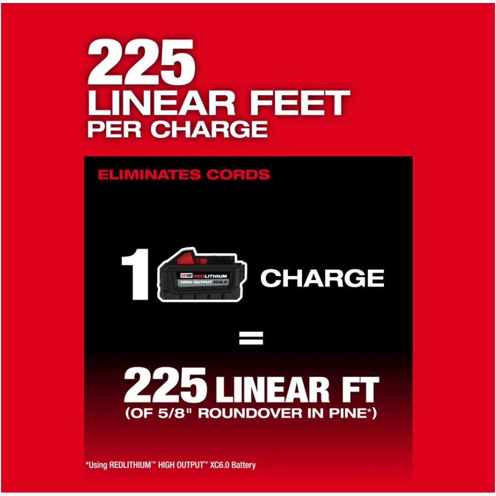 Designed for the professional carpenter and remodeler, the MILWAUKEE M18 Fuel 1/2 inch. Router delivers best-in-class cordless performance with 2.25 peak horsepower, the best control and comfort in the application, and over 225 linear feet of runtime per charge. The Powerstate brushless motor delivers less bog down under load for clean, precise cuts and more material removed per pass. RedLinks Plus intelligence ensures maximum performance and protection from overload, overheating, and over-discharge. The ergonomic BODYGRIP and over-mold pommels provide the best control and comfort in application to enhance productivity and reduce fatigue. The M18 Redlithium high output XC6.0 battery pack (not included) provides up to 225 linear feet per charge of 5/8 round overs in pine and the power to tackle the toughest applications found on the jobsite. The variable speed dial has an adjustment range from 25k to 12k RPM to optimize cuts across a wide range of bits and materials. The router is equipped with a micro-adjust knob and macro-adjust button with over 2 inch. of travel to provide users with fast, accurate depth adjustments. The cordless router features dual-LED lights to illuminate the work surface, a spindle lock for quick one-wrench bit changes, and a modular console design for compatibility with the Milwaukee 1/2 inch. Router Plunge Base (not included).