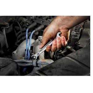Our SAE Ratcheting Combination Wrenches feature 2.5 degrees of arc swing and 144 ratcheting positions, allowing quick and efficient work in tight spaces. Our ratcheting wrench has double-stacked pawls within the ratcheting mechanism, which increases durability and extends the life of the tool. Our MAXBITE Open-End Grip improves the wrench’s grip on nuts and bolts, offering 25% more torque than smooth-faced wrenches. The combination wrench features an ergonomic I-Beam handle design for improved comfort and ink-filled size labels for easy size identification and quick distinction between SAE and metric sets. The MILWAUKEE SAE wrench sizes range from 1/4″ to 1-1/4″ and are backed by our Lifetime Guarantee.