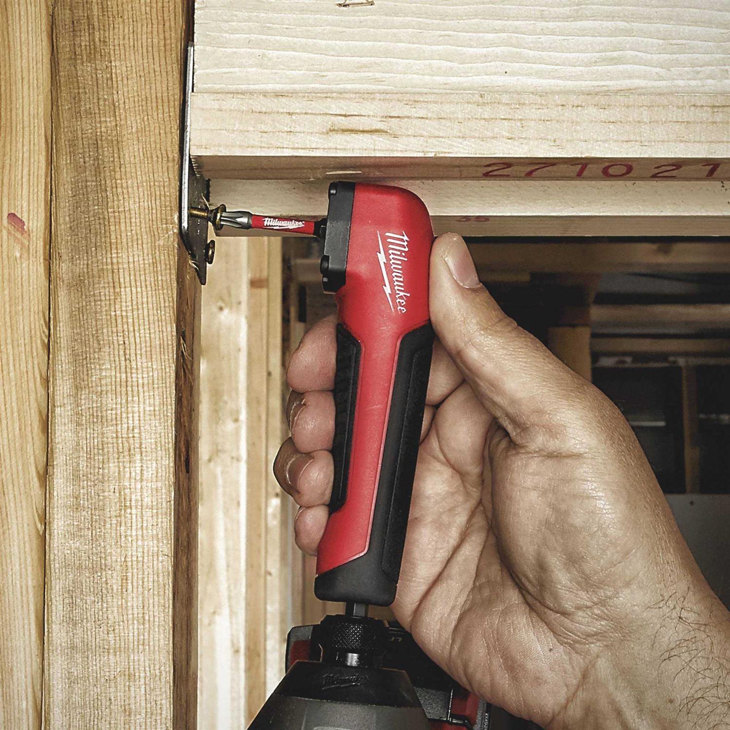 This Milwaukee Shockwave Right Angle Drill Adapter with its 1.4 in. slim profile provides access into tight areas. The Internal Shockzone absorbs peak torque and stops breaking. For increased torque transfer, it offers hardened gears. You can use it in both drill drivers and impact drivers and works with all 1/4 in. hex shank accessories.Made with custom alloy 76 steel, it allows years of use.