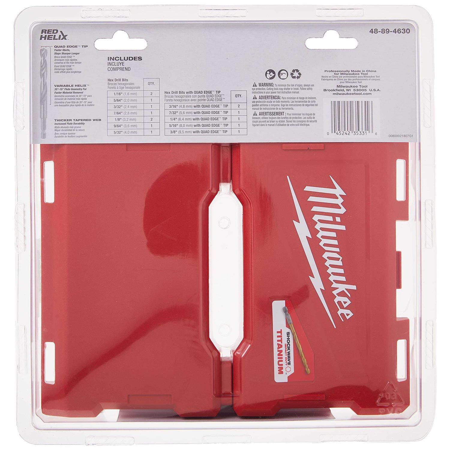 Milwaukee SHOCKWAVE Impact Duty Titanium Drill Bits with RED HELIX are engineered for impacts and drills. Designed with a Variable Helix with an aggressive 35° Helix Angle which ends at 15°, the Impact Duty Titanium Drill bits with RED HELIX provide Rapid Chip Removal to limit heat buildup to Stay Sharper Longer. The 135° split point tip delivers a precision start and prevents walking for fast, accurate holes. Titanium coating can be used in all drilling applications to give you up to 3X life vs. Black Oxide Drill Bits.