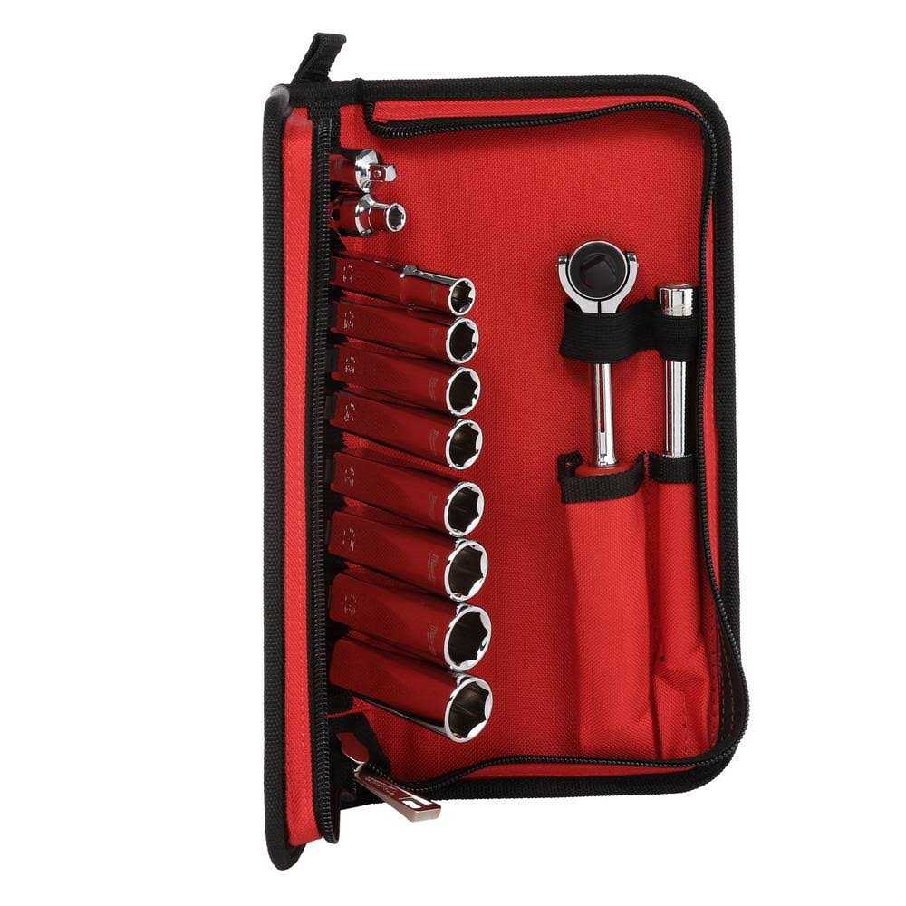 Milwaukee s 12pc 3/8 Drive Ratchet Set delivers ultimate versatility and access. The slim-profile ratchet features a pivoting head that can be used as a ratchet, a nut driver, or any angle in between. Milwaukee s proprietary sockets feature a parallel flat design for wrench compatibility and to deter rolling. Socket sizes are stamped into the flats for improved visibility. The kit is stored in a soft-sided carrying case that includes a socket rail to keep sockets and accessories organized, both on and off the jobsite.