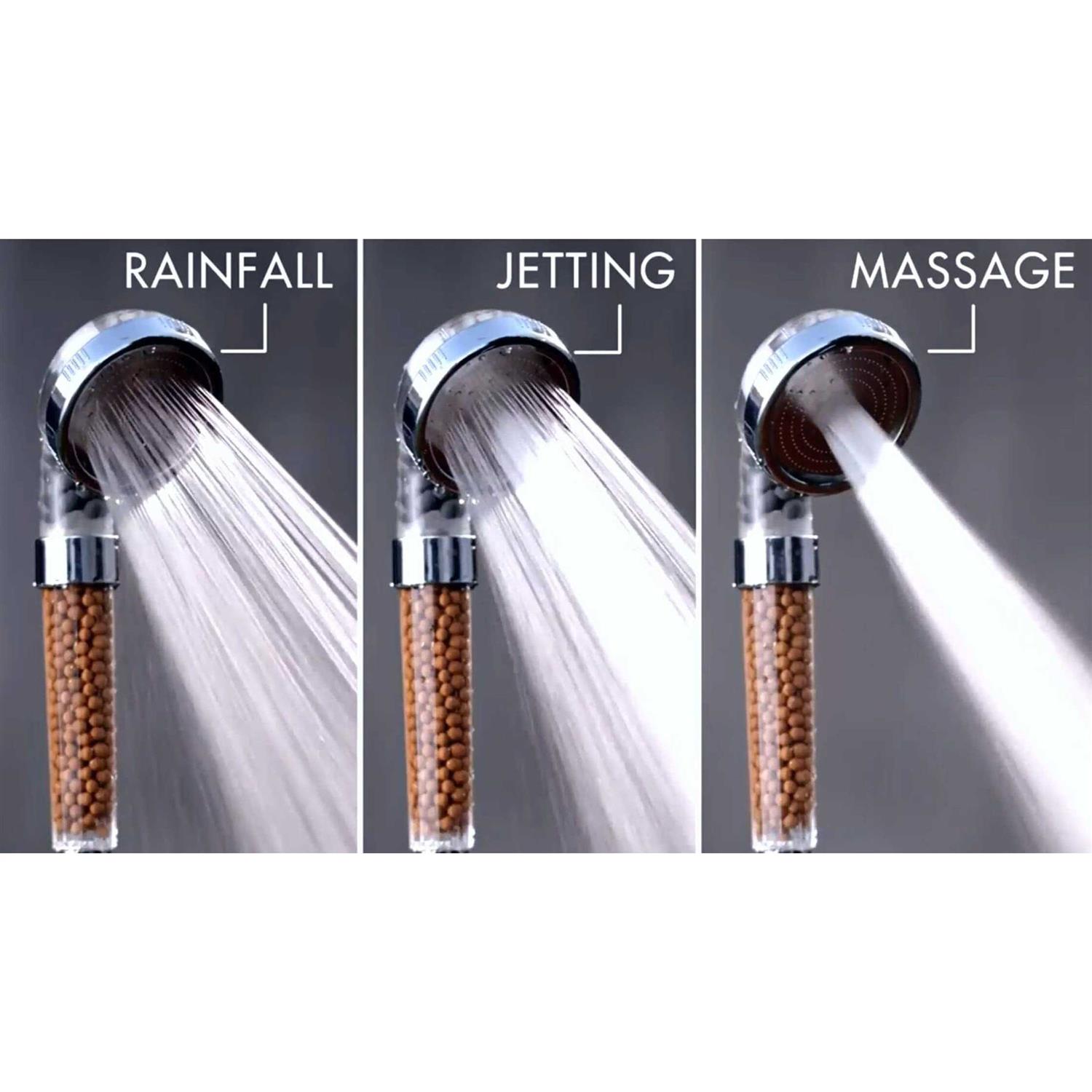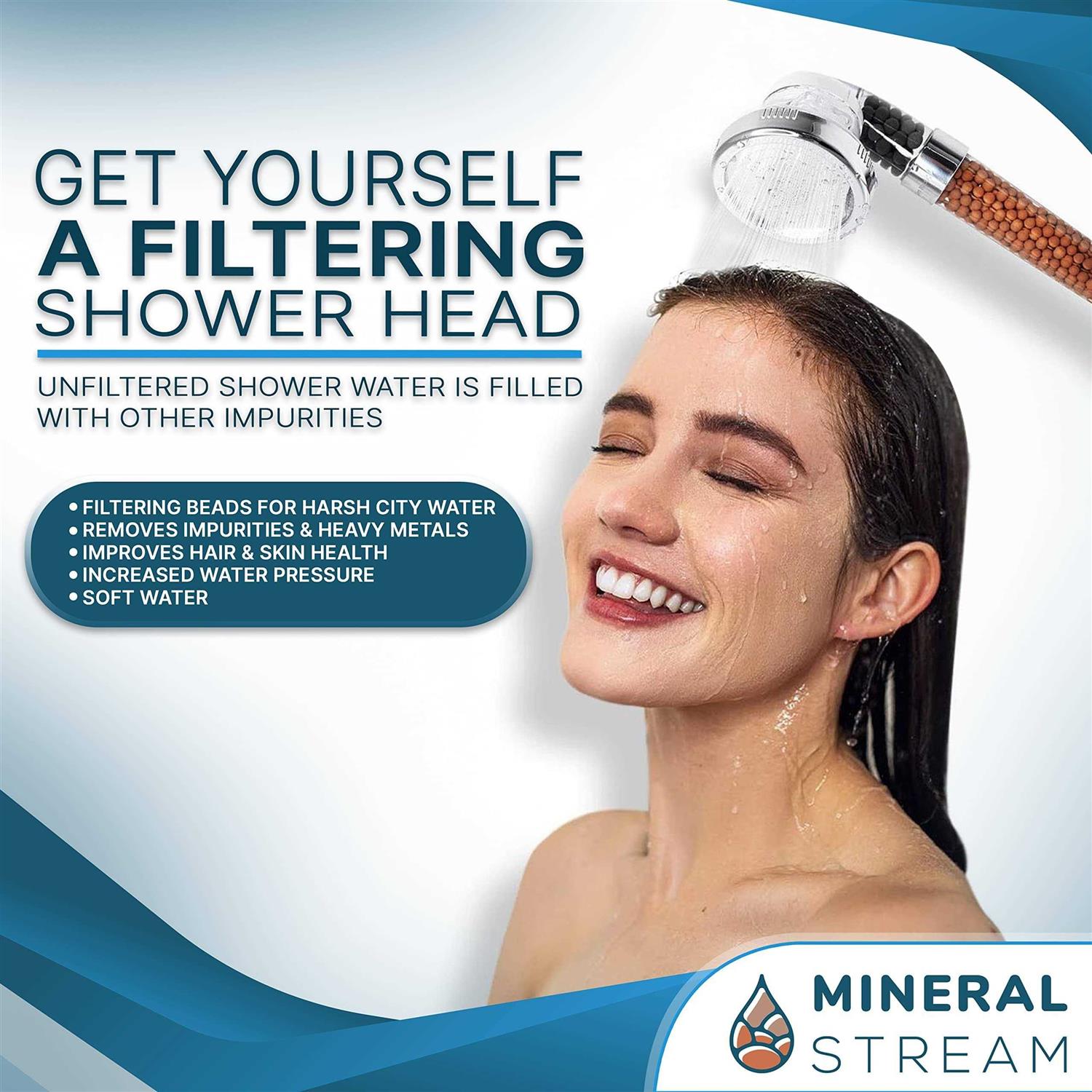RAINFALL, JET & MASSAGE MODES: 3 spray settings are available on the MineralStream handheld shower head, including rainfall, jetting, and massage. Suitable for offering a relaxing showering experience for your families, including pets. Additionally, you can clean everywhere with the hydro jetting mode, including tile, corners, and bathrooms. FILTRATION METHOD: The water can be made cleaner by using a filtered shower head with a high-density filter system and two different types of pure natural mineral beads built in. Your skin and hair become softer and smoother because of the purifying and softening water, which also maintains the balance of your body. EASY INSTALLATION: Connects to any standard threaded shower arm in minutes, no tools required. Includes a 1.5m shower hose, hand shower holder and a shower arm diverter. STRONG SPRAY & WATER SAVING: Due to its mega hole design, the MineralStream high pressure shower head uses up to 30% less water than a standard shower head while increasing water pressure by 200%. Your entire body is enveloped in a deep, full-bodied bath that is produced by it. SUITABLE FOR EVERY HOUSEHOLD: The MineralStream has a standard connection just like other shower heads. This means that the shower head fits perfectly in 95% of households. So you don’t have to worry about installation problems. Ionic Shower Head