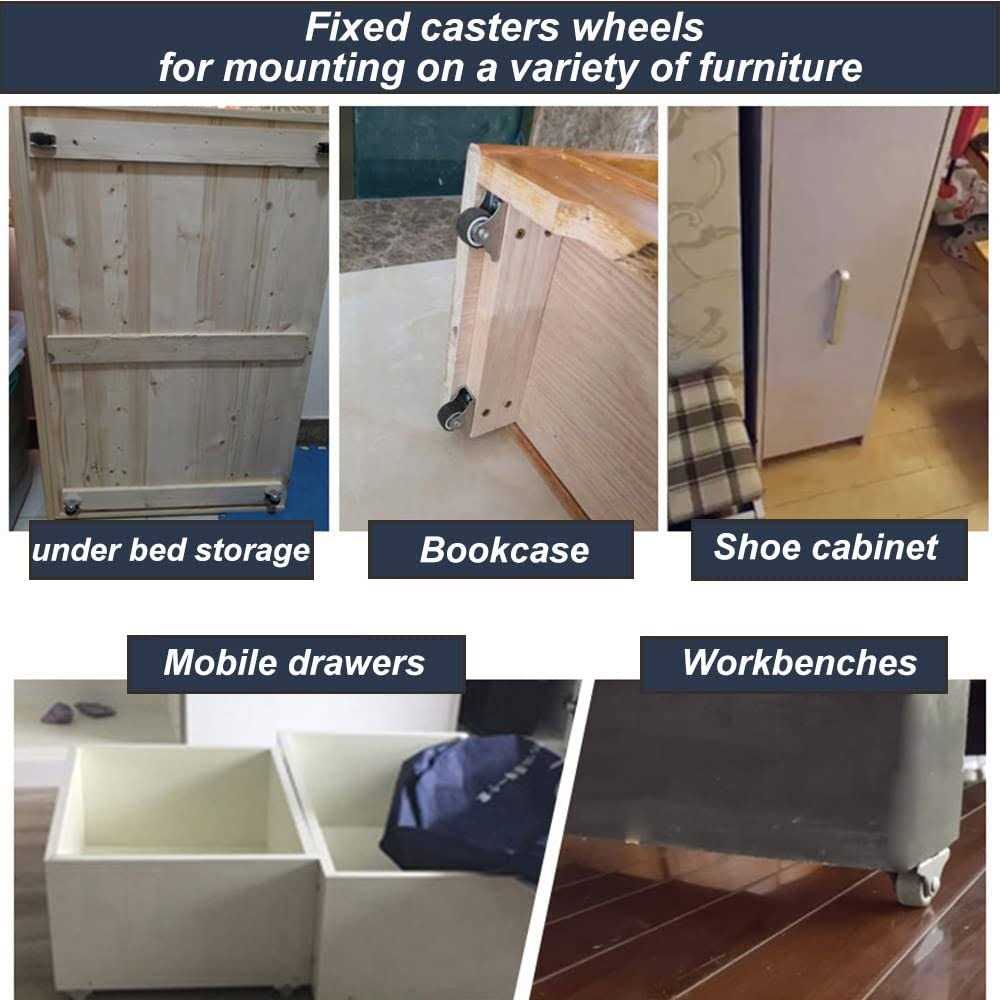 MULTIPLE USE: These ball bearing small caster wheels are ideal for a huge variety of uses DIY to applications home, office, schools, garage, shops, hospitals etc perfect fixed small casters, for small equipment and small space furniture, including chairs, ottoman, coffee tables, plant stands, bookshelves, kitchen cabinet, spice cabinet, shoe bins, toy bins, trolley cart, workbench, under bed storage cabinet etc furniture low profile wheels easy movement and work without effort. LIGHTWEIGHT/SILENT: These furniture directional casters feature silent ball bearings inside, TPE rubber wheels and metal top fit perfectly, are more sturdy and also with rubber casters run smoothly on laminate flooring as well as carpet. They have obviou sreduced the noise; rubber casters have internal ball bearings that are quick rolling , the surface is sleek, equipped with dust covers on both sides that wouldn’t allow it to get stuck by hair, crumbs and grit. NO FLOOR MARKS CASTERS: Silent mini casters wheels offer the elasticity of rubber wheels combined with the toughness and durability of metal wheels. Safe for all floor types laminate, wood, tile, glass, carpet, concrete, marble and, etc. silent small caster wheels for cart are made from rust-proof metal and rock-solid construction that make them the strongest in their class, The Non rotating directional small caster wheels can move very smoothly. SAVE YOUR BACK AND EFFORT: Are you pushing or carrying your equipment? don’t put pressure on your back and save your energy by installing these new low profile casters to move heavy objects to your equipment, watch how easy and effortlessly you can maneuver your furniture caster wheels smooth and easy rolling, slides easily in and out. Mini Casters are widely used for a multitude of applications, Silent Mini Casters Wheels for small equipment and small space furniture including ottoman, coffee table, plant stands, bookshelves, kitchen cabinet, spice cabinet, shoe bins, toy bins, shopping carts, trolley, workbench, under bed storage cabinet etc. Note: Install Small Caster Wheels position ensure smooth and easy rolling, slides easily in and out. Please Note: 1. Due to the hand measurement, there have size error about 1-2 mm. 2. That due to lighting effects and monitors brightness/contrast settings etc, the color tone of the photo and the actual item could be slightly different.