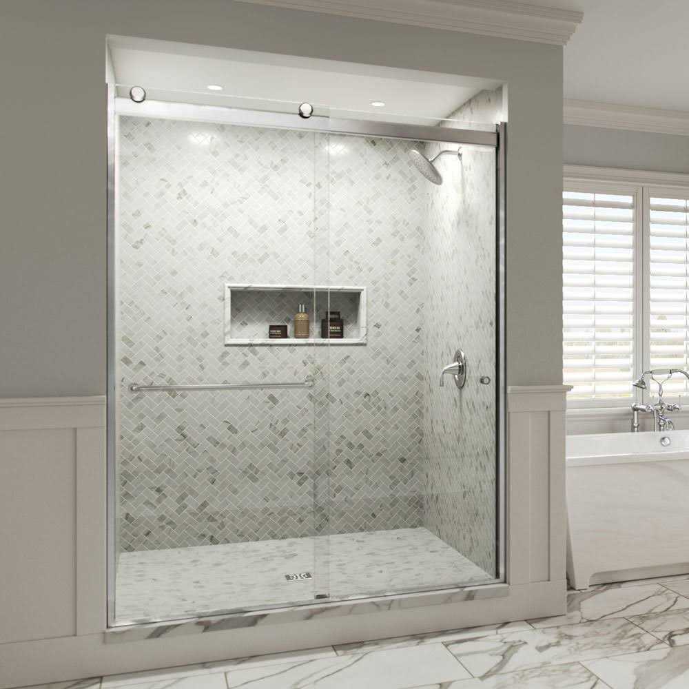 With its semi-frameless design and sleek header, the Miseno Revolution sliding shower door adds modern touch to your shower enclosure. This door features a dual bypass rolling design and uses two rollers and an anti-jump mechanism to ensure smooth opening and closing. Crafted from ultra-durable safety-tempered glass, the two 1/4-inch thick heavy-cut clear glass panels beautifully showcase the interior of your shower. And thanks to its precise panel fitting, this door helps eliminate leaks to keep your bathroom tidy. Ideal for all wall substrates – including fiberglass, acrylic, and tile – this shower door is easy to install and coordinates with a variety of contemporary styles.