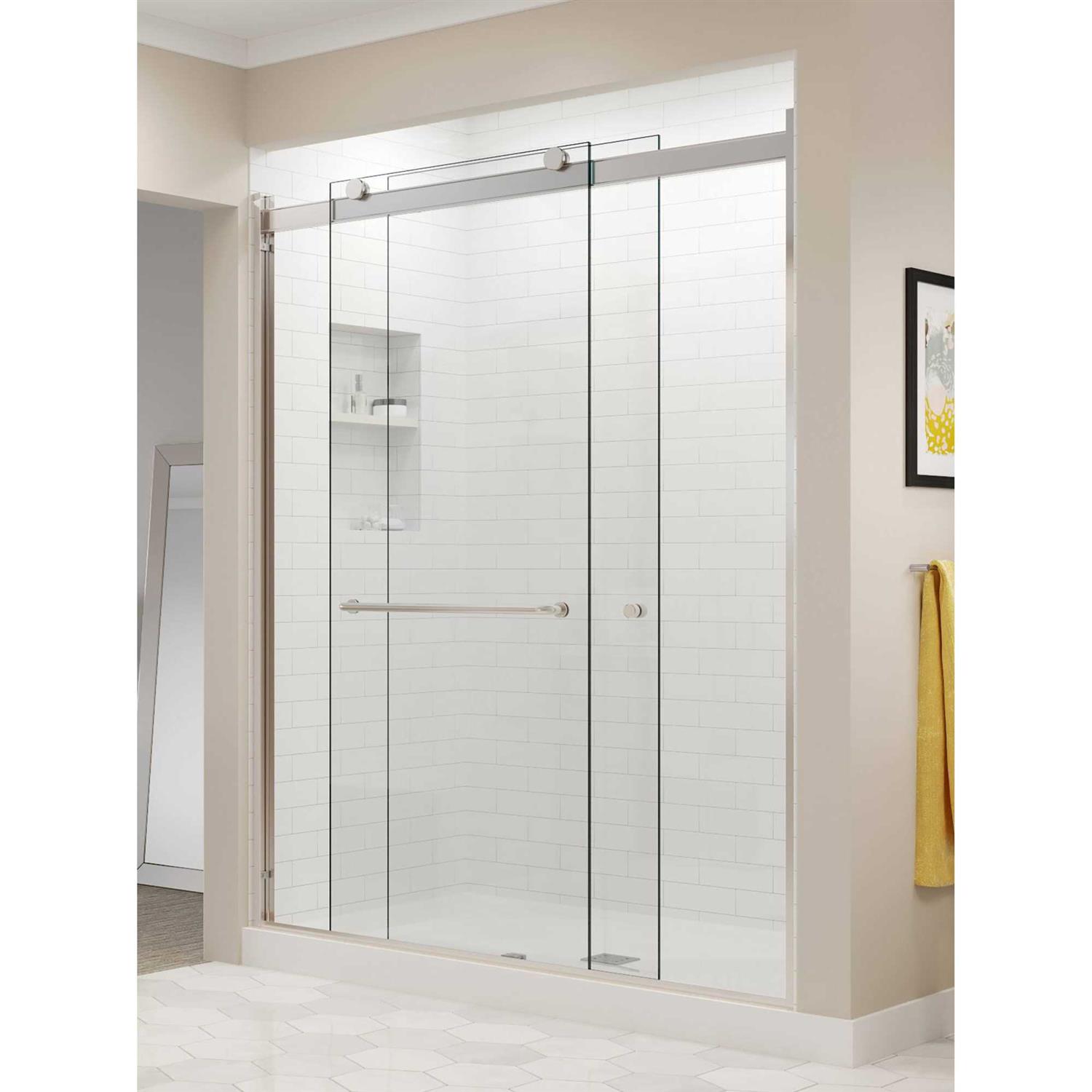 With its semi-frameless design and sleek header, the Miseno Revolution sliding shower door adds modern touch to your shower enclosure. This door features a dual bypass rolling design and uses two rollers and an anti-jump mechanism to ensure smooth opening and closing. Crafted from ultra-durable safety-tempered glass, the two 1/4-inch thick heavy-cut clear glass panels beautifully showcase the interior of your shower. And thanks to its precise panel fitting, this door helps eliminate leaks to keep your bathroom tidy. Ideal for all wall substrates – including fiberglass, acrylic, and tile – this shower door is easy to install and coordinates with a variety of contemporary styles.