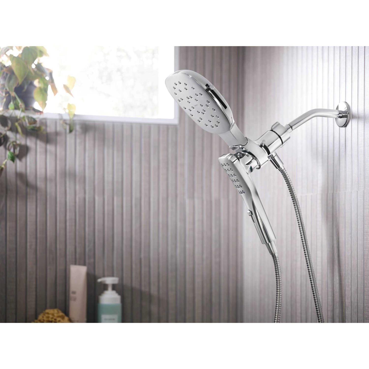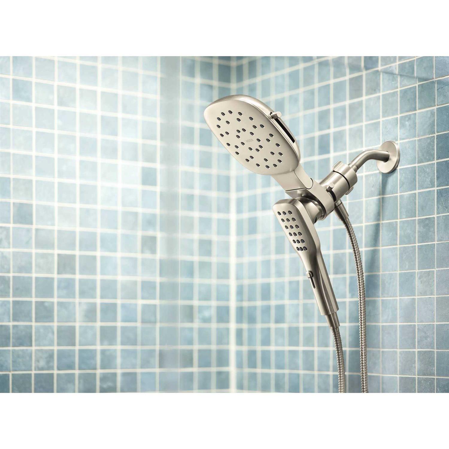 Moen The Verso Combination Shower featuring Infiniti dial offers both a rainshower and handshower in one sleek design while providing a customized shower experience. The new Infiniti dial featured on both showerheads provides unlimited spray and coverage options so you can find the perfect shower to meet your needs. Simply slide the dial to seamlessly switch between spray modes with no pause in experience. The rainshower showerhead also can pivot for more shower spray angle options. The Combination Shower provides a 3-in-1 design. The rainshower and handshower can each run separately or together for a customized experience. For added convenience, the handshower includes Moen’s Magnetix technology that includes a powerful magnetic dock for easy release of the handshower and a secure snap back into place – even when eyes are closed.