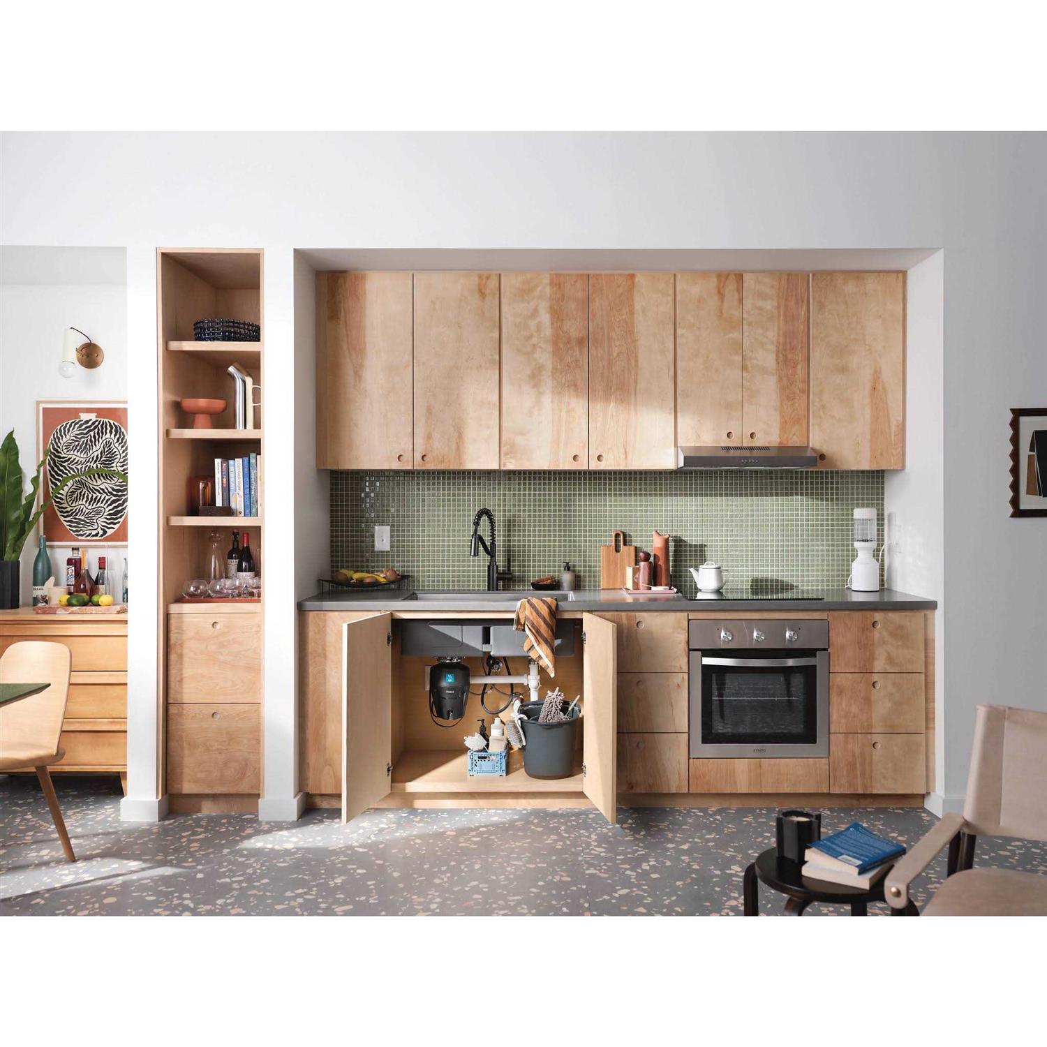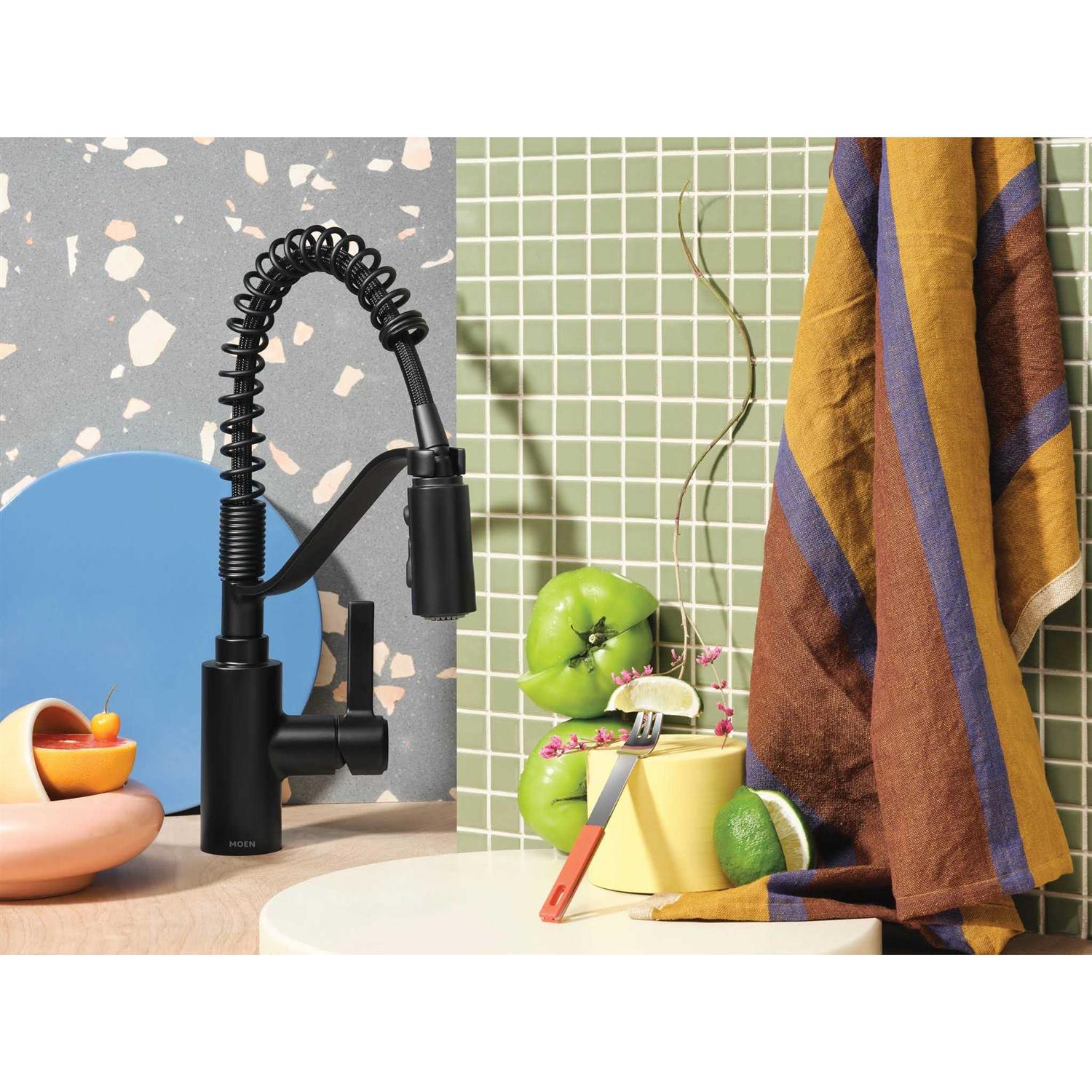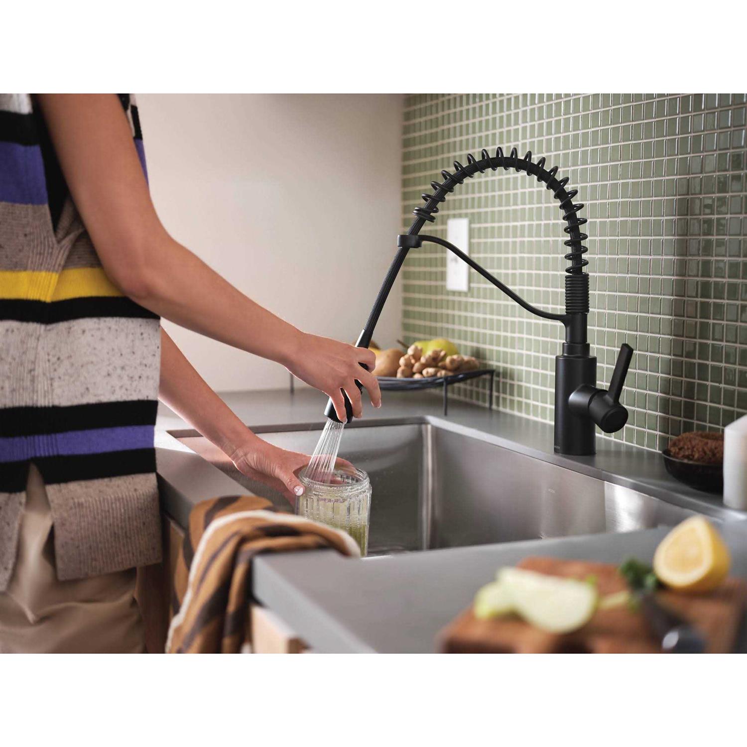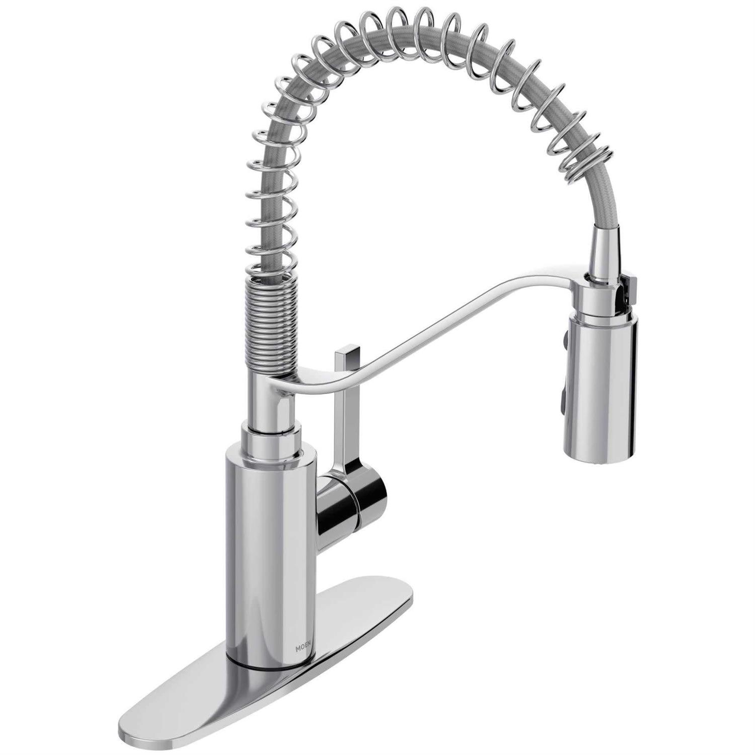 Genta LX pre-rinse spring kitchen sink faucet blends modern and industrial design, bringing big style to small kitchen spaces. The simple, yet eye-catching look of genta LX paired with the lower-profile spring design adds a contemporary feel to galley kitchens while enhancing functionality. Available in MOEN chrome finish to add a clean, fresh look to your kitchen.