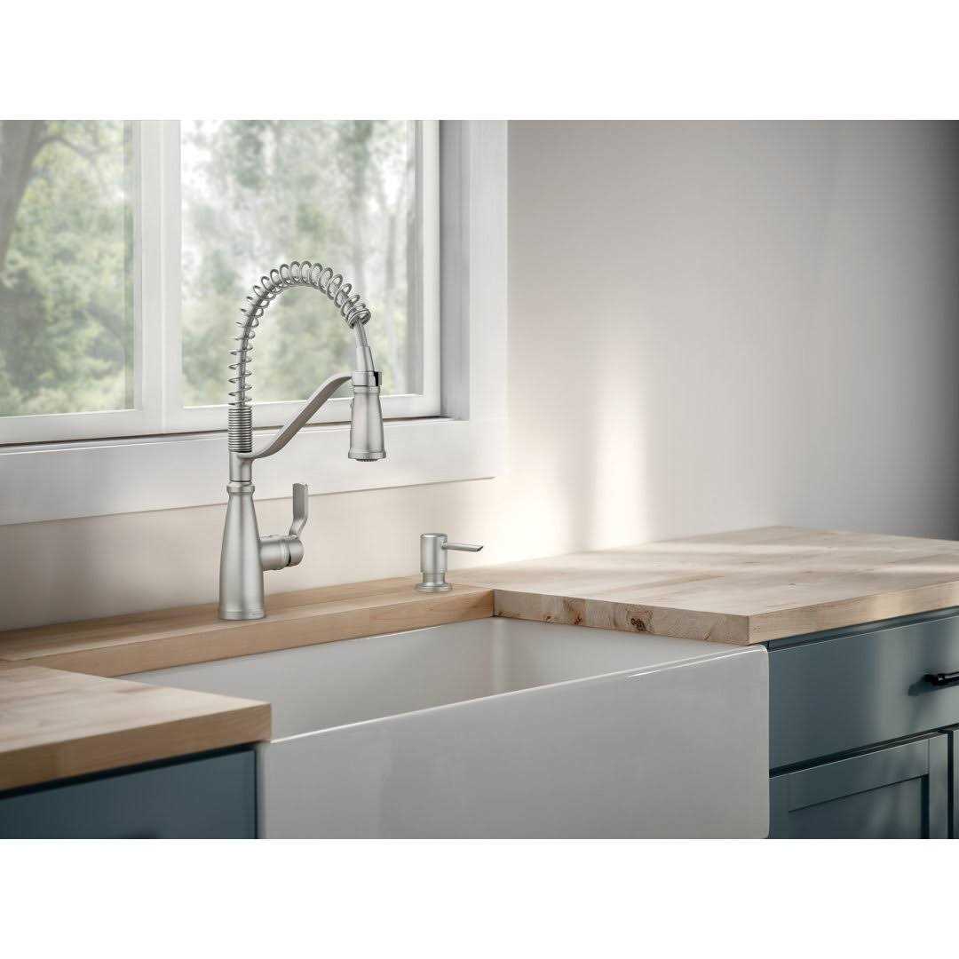 The Nolia Pre-Rinse Spring kitchen sink faucet offers a fresh take on industrial farmhouse design with the enhanced functionality of a spring faucet. The Nolia collection features a classic look that works well with a variety of traditional and transitional kitchen decor preferences. Now with a lower profile, this Spring Galley kitchen faucet provides the convenience of a traditional spring faucet while maintaining a compact design for smaller sink spaces. Available in MOEN Spot Resist Stainless finish to minimize fingerprints and water marks, providing a clean finish.