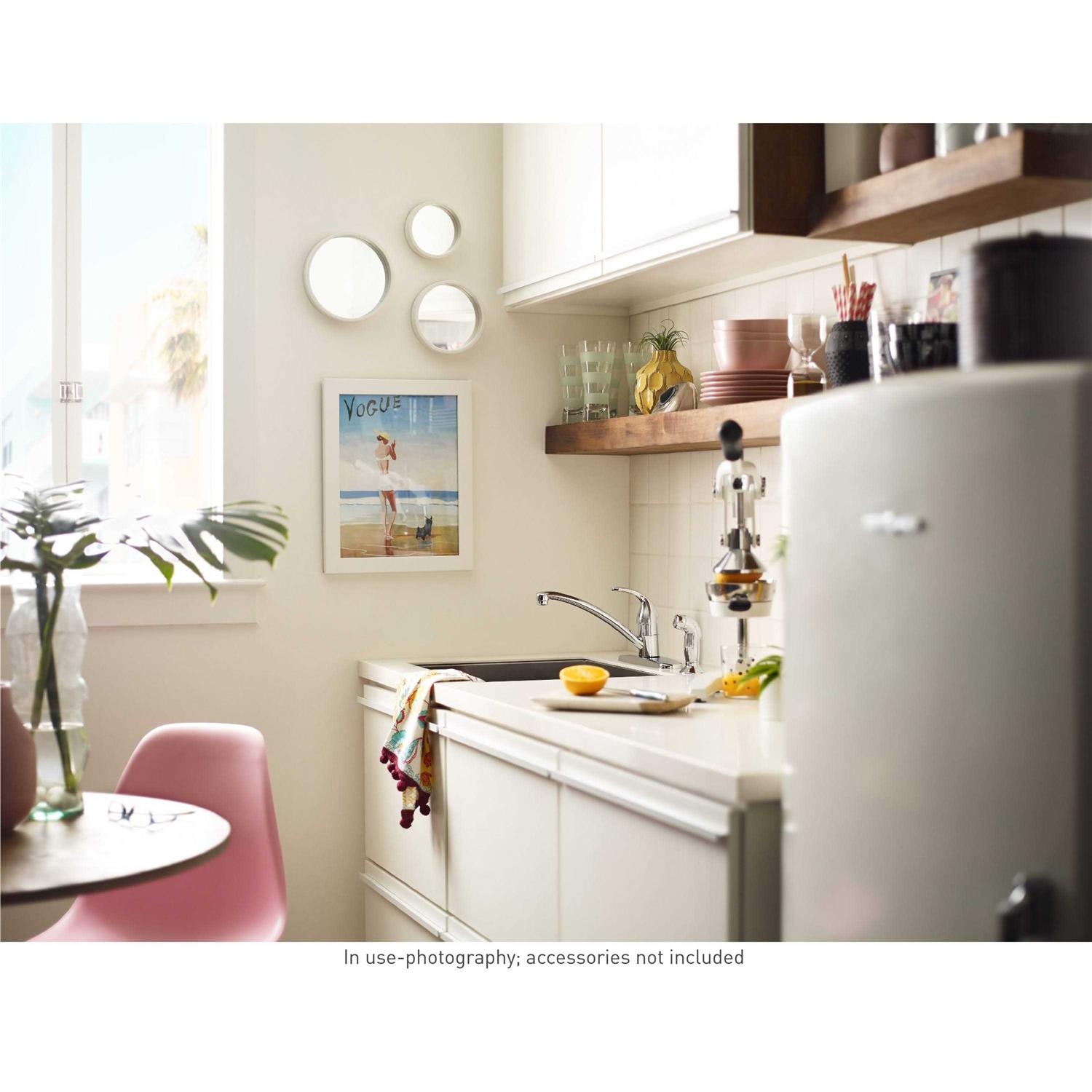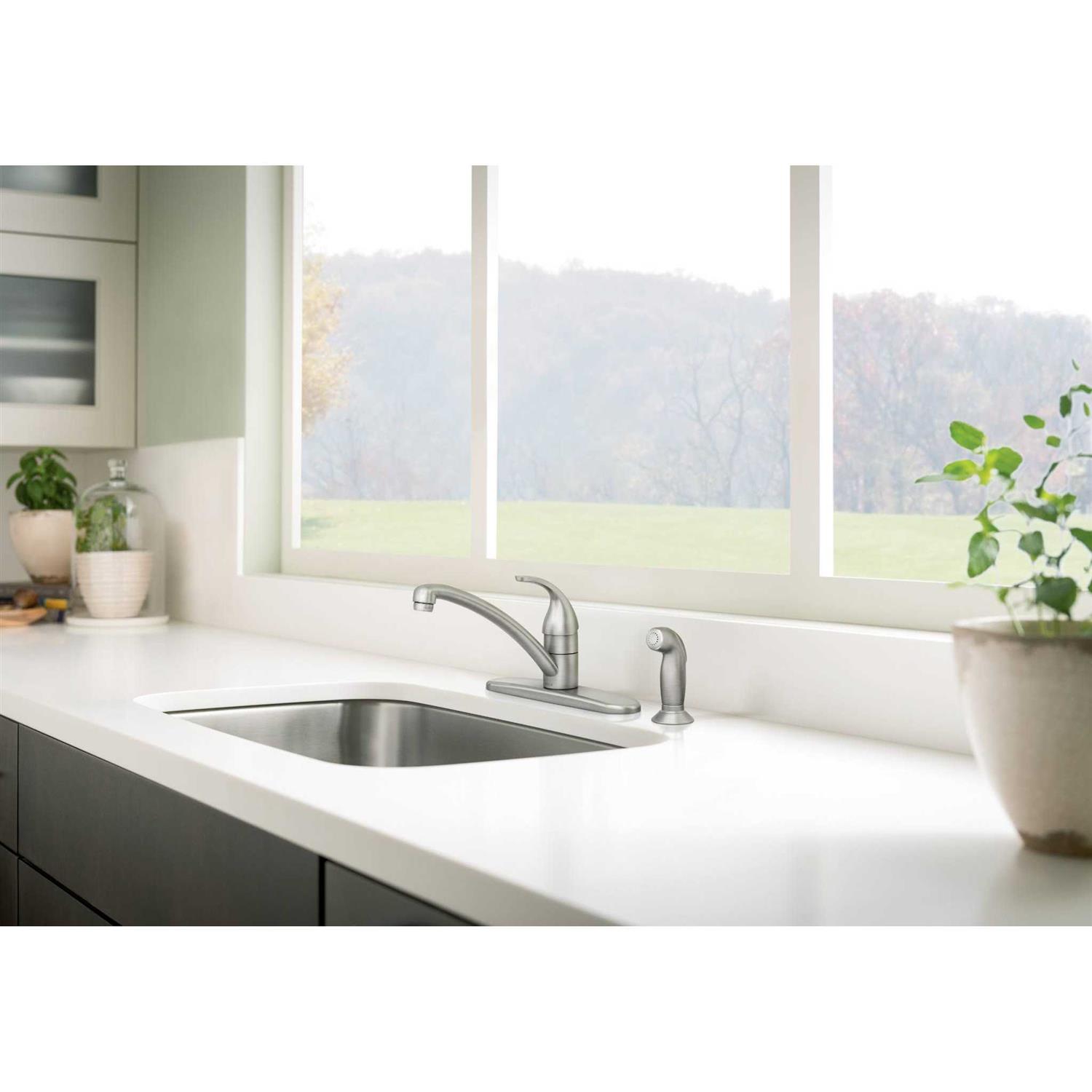 With its smooth curves and minimalistic design, the Adlerā„¢ one-handle faucet seamlessly blends with a variety of kitchen dĆ Ā cor preferences. The one-handle lever makes it easy to adjust the water and a matching side spray is included to make cleanup simple. Install with ease thanks to the new tool-free faucet installation. Adler installs up to 40% faster versus Moen faucets without the new installation feature. It mounts with a deckplate, accommodating four-hole installation options.