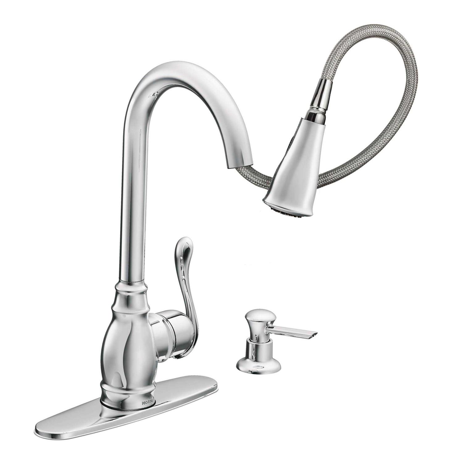 Faucet body constructed of metal to ensure durability and dependability Covered under Moen’s limited lifetime faucet warranty Finishes resist corrosion and tarnishing through everyday use – finish covered under lifetime warranty The graceful design of the Anabelle family of products will add an elegant touch to any home Moen sets the standard for exceptional beauty and innovative reliable design Single handle operation for ease of use Soap/lotion dispenser included with faucet Pullout spray faucet head with 68 inch hose enhances faucets versatility Dimension – 25.13 inch x 8 inch x 13.25 inch.