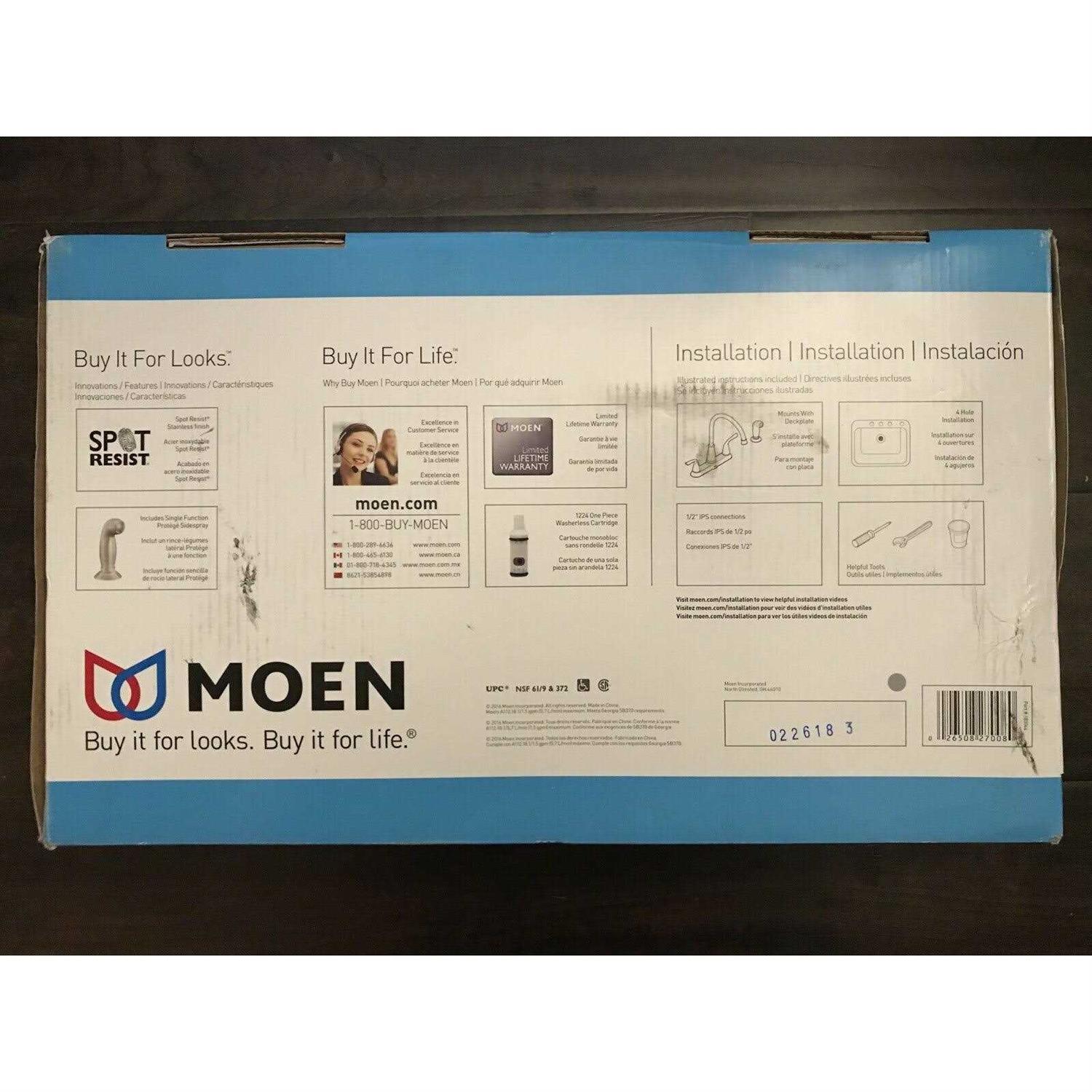 The MOEN Brecklyn 2-Handle Side Sprayer Kitchen Faucet in Spot Resist Stainless has a traditional design and works with almost any kitchen decor. With a dual-handle design, you can precisely control the water temperature. It includes a convenient side sprayer, ideal for washing large pots and pans, and rinsing the sink down afterwards.