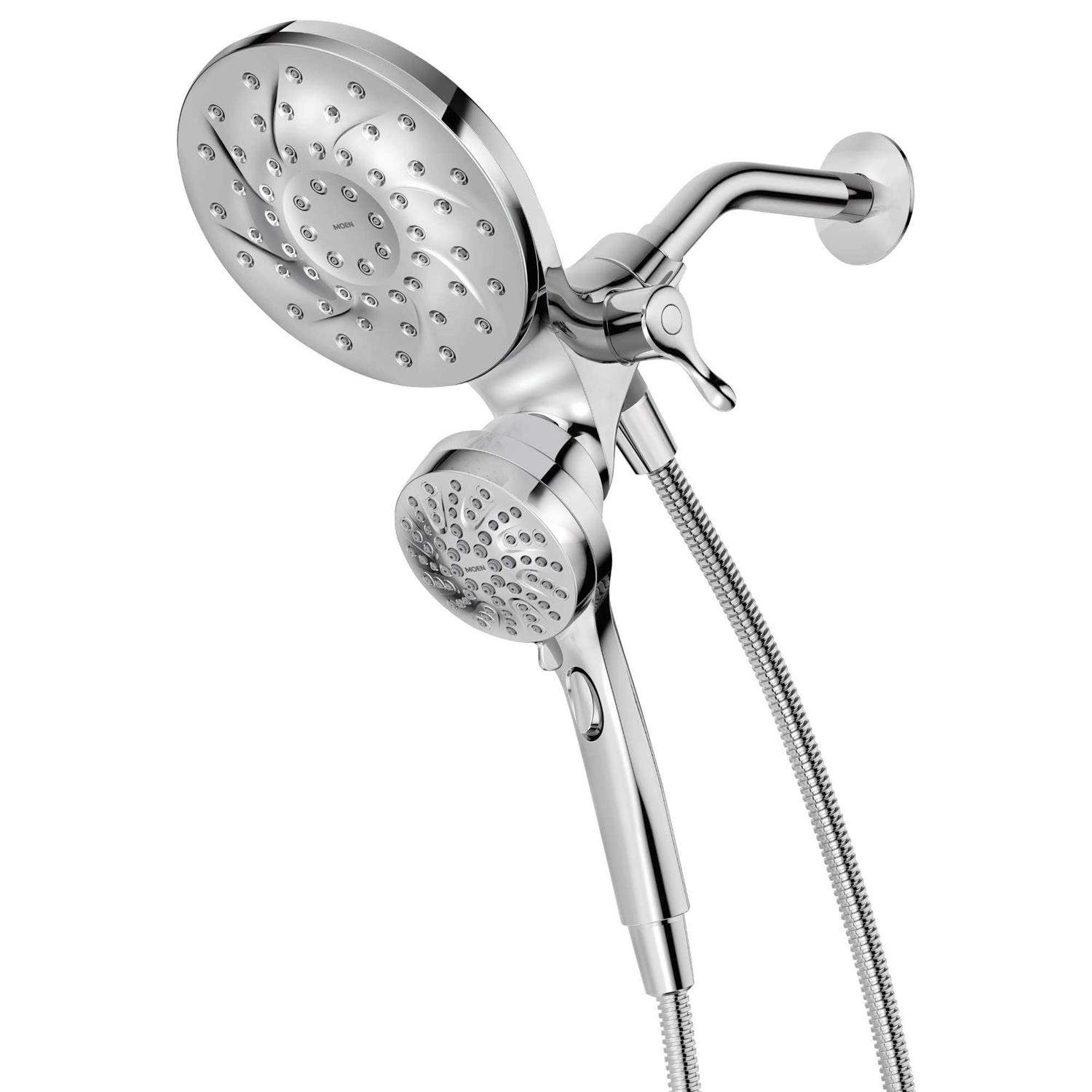 The Moen Magnetix handshower and shower head includes a full-coverage rainshower and a handshower with six settings. You can use the two heads separately or combined when you want more coverage. The kink-free hose on this unit extends your reach and allows flexibility during use. This combined shower unit has a highly reflective, mirror-like chrome finish that’s designed to resist fingerprints and water spots. Magnetix technology provides a magnetic docking system, soothing massage, downpour, wide coverage, relaxing massage, and rinse and pause features.