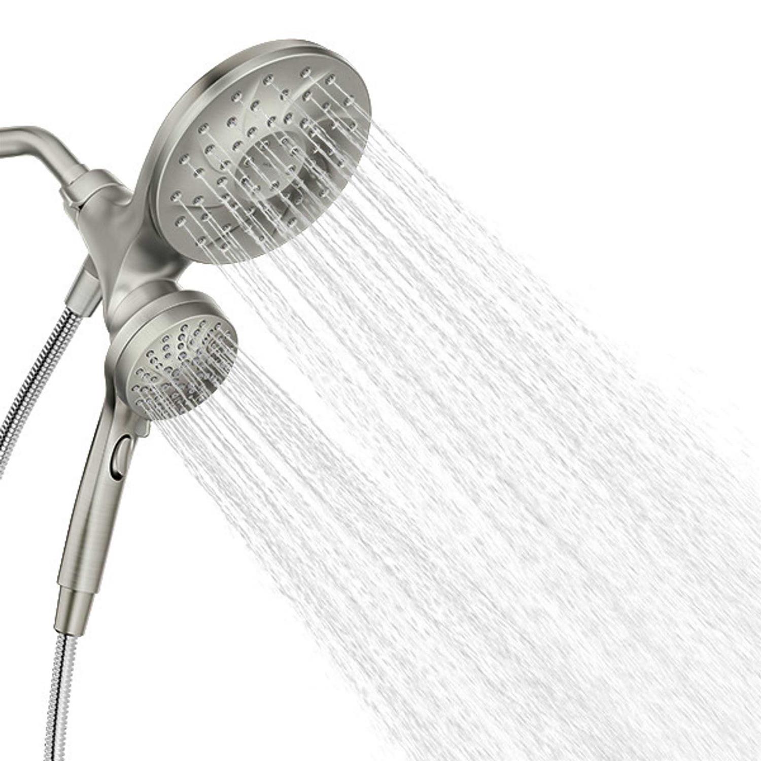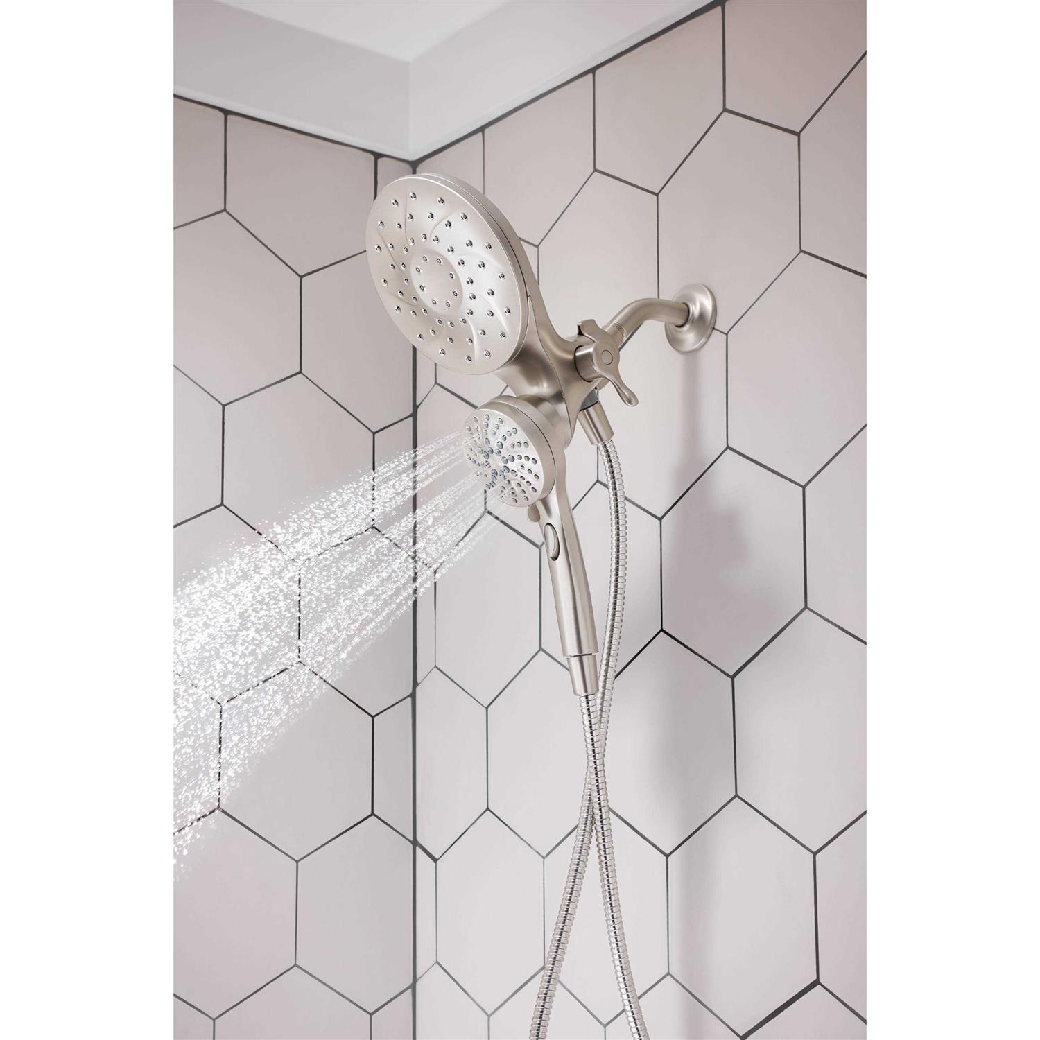 The Moen Engage magnetix six-function shower head and handheld shower with magnetic docking system were inspired by patterns found in nature. It offers a distinctive design that matches any transitional decor. Gracious and uncomplicated style features give the Engage collection an ageless yet fashion-forward presence. The six-function shower head offers a personalized shower experience. The handheld shower head, with a 60-inch kink-free metal hose, provides easy reach.