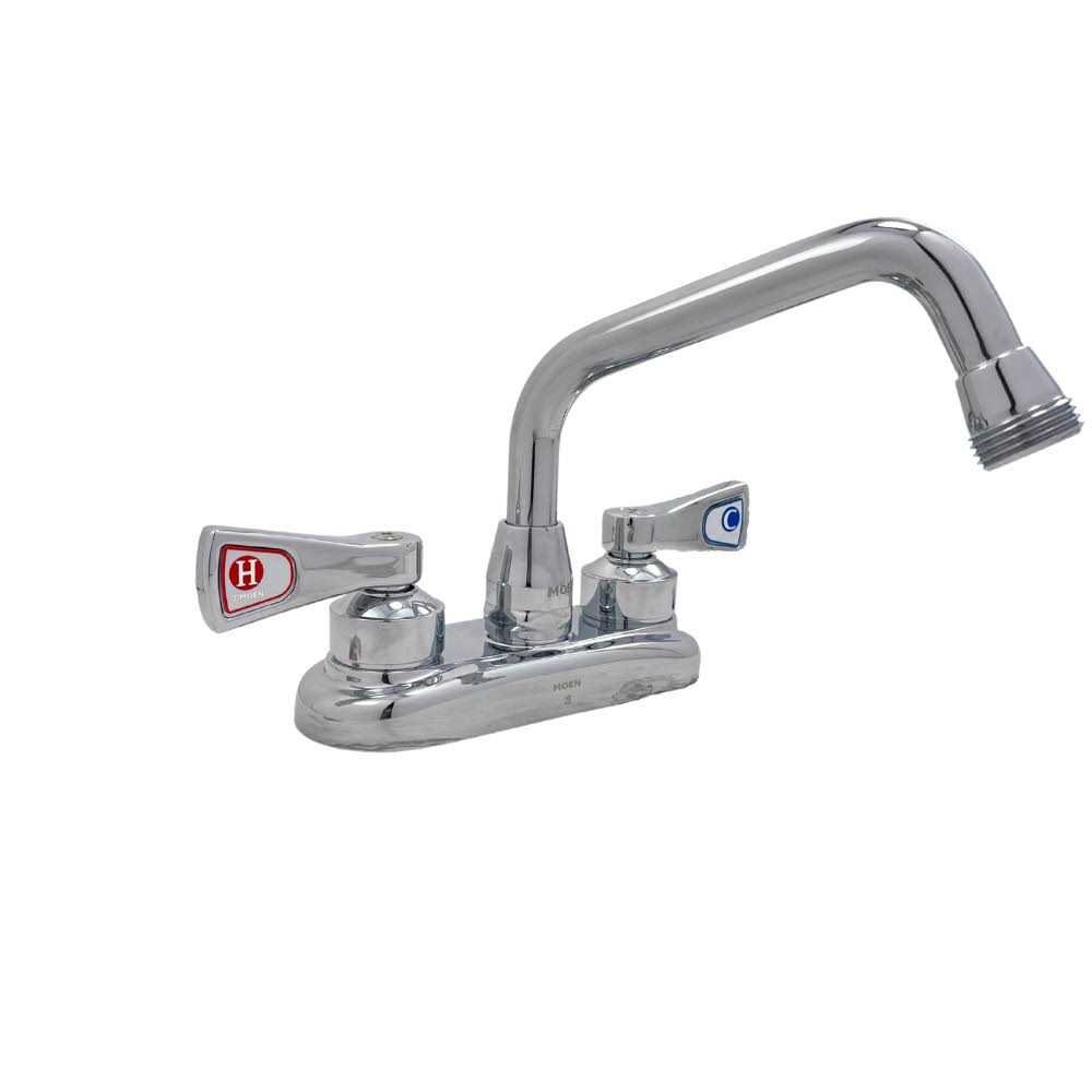 The graceful lines and attention to detail in this Moen 8277 M-DURA Centerset Commercial Kitchen Faucet are designed to make impressions that last. It features a stylish chrome finish and a traditional low-arc spout design. This heavy-duty kitchen faucet features two levers for hot and cold water respectively, making it easy to use. It is easy to install thanks to its centerset design, and it is also vandal resistant.