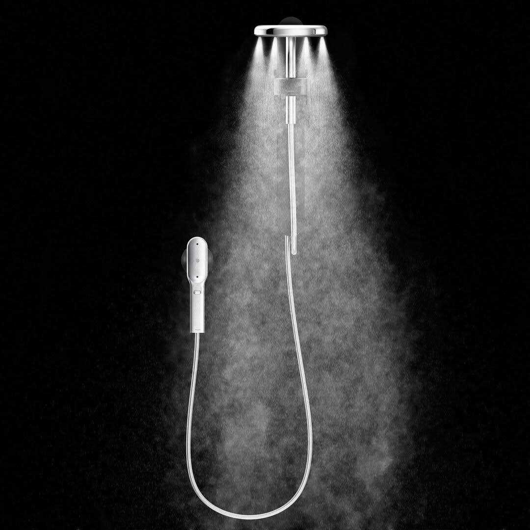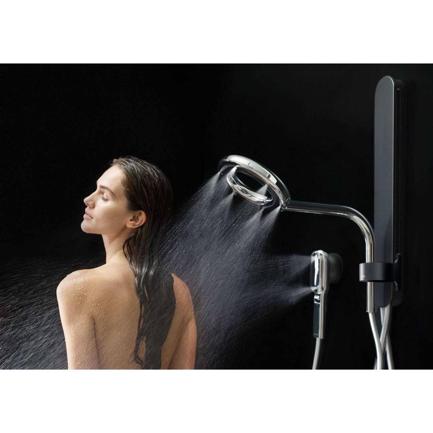 Nebia by Moen is a better experience with a spa shower delivering up to 45% water savings when compared to a standard Moen 2.5 gpm showerhead. For optimal experience install in a fully-enclosed shower and install handshower dock at hip level. The 7.9 Rainshower has the coverage of a 20 showerhead when measured to EPA standards for coverage. A 17 adjustable sliding arm allows users to move the Rainshower up or down based on their height as well as water warmth and body coverage preferences. Use the Rainshower alone or use the Rainshower and Handshower together. Use the Handshower as a spa-like body spray when docked to the wall or remove from the magnetic dock to direct water right where you need it for optimal warmth. The Handshower features a powerful magnetic dock that can be installed at your desired height with a permanent adhesive or traditional bracketing system. Includes a 59 hose and an easy on/off switch on Handshower. Rainshower tilts up and down and rotates side to side by pushing tube.
