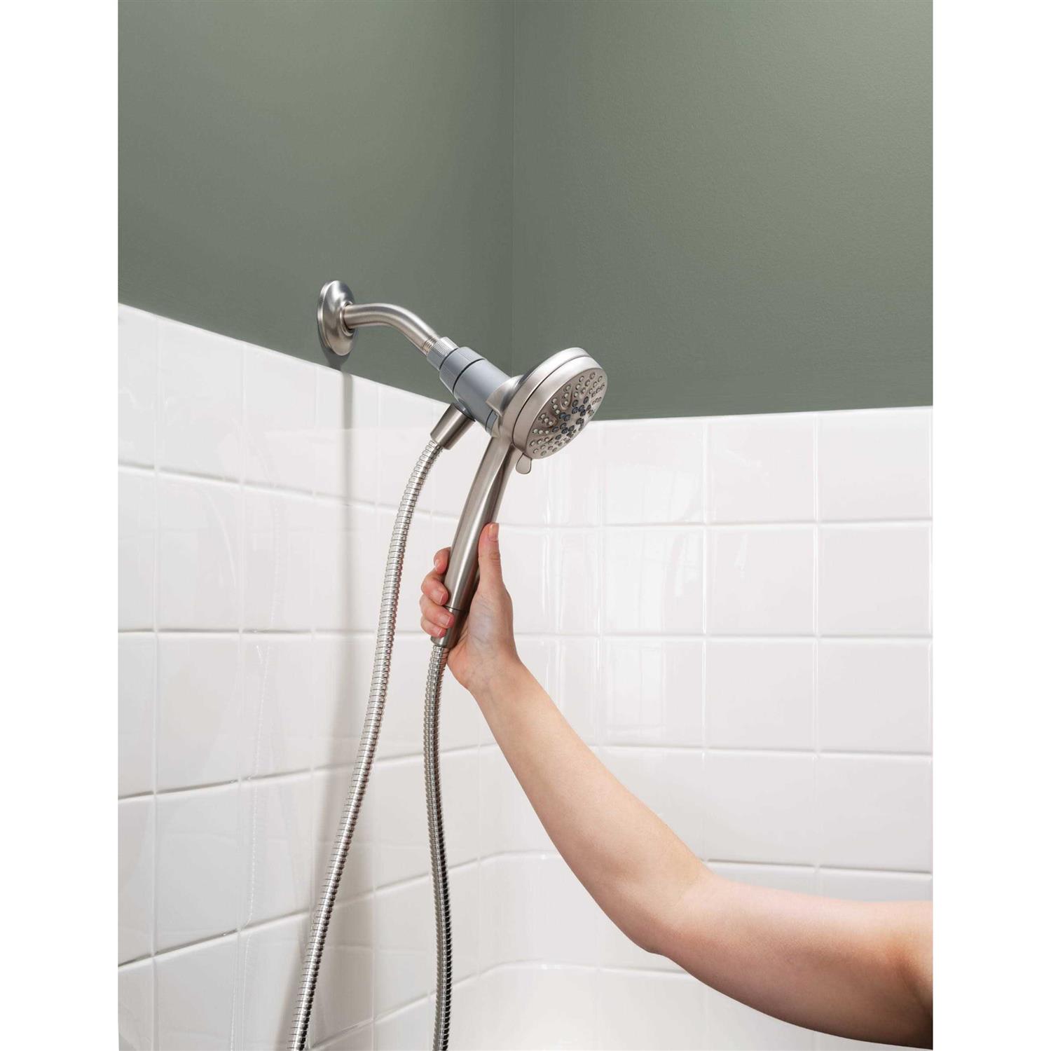 Moen Engage Brushed Nickel 6 Function Spray Handheld Shower will add a sleek and classic touch to any bathroom. With its subtle design and warm accents, this handheld shower features a 3.5 in. diameter head that has a 6-function combination spray with optimized pressure in each setting to best suit your shower preferences. The six spray options include downpour, wide-coverage, rinse, massage, relaxing massage, and soothing massage. Its 60 in. kink-free metal hose extends its reach and flexibility for added coverage. Megnetix technology provides you with a magnetic docking system for easy release and returns, allowing you to use it even with your eyes closed. The Spot Resist brushed nickel finish resists fingerprints and water spots for a cleaner-looking bath. As an added bonus, this handheld shower is WaterSense labeled, using 20% less water than the industry standard, saving you money without compromising performance.