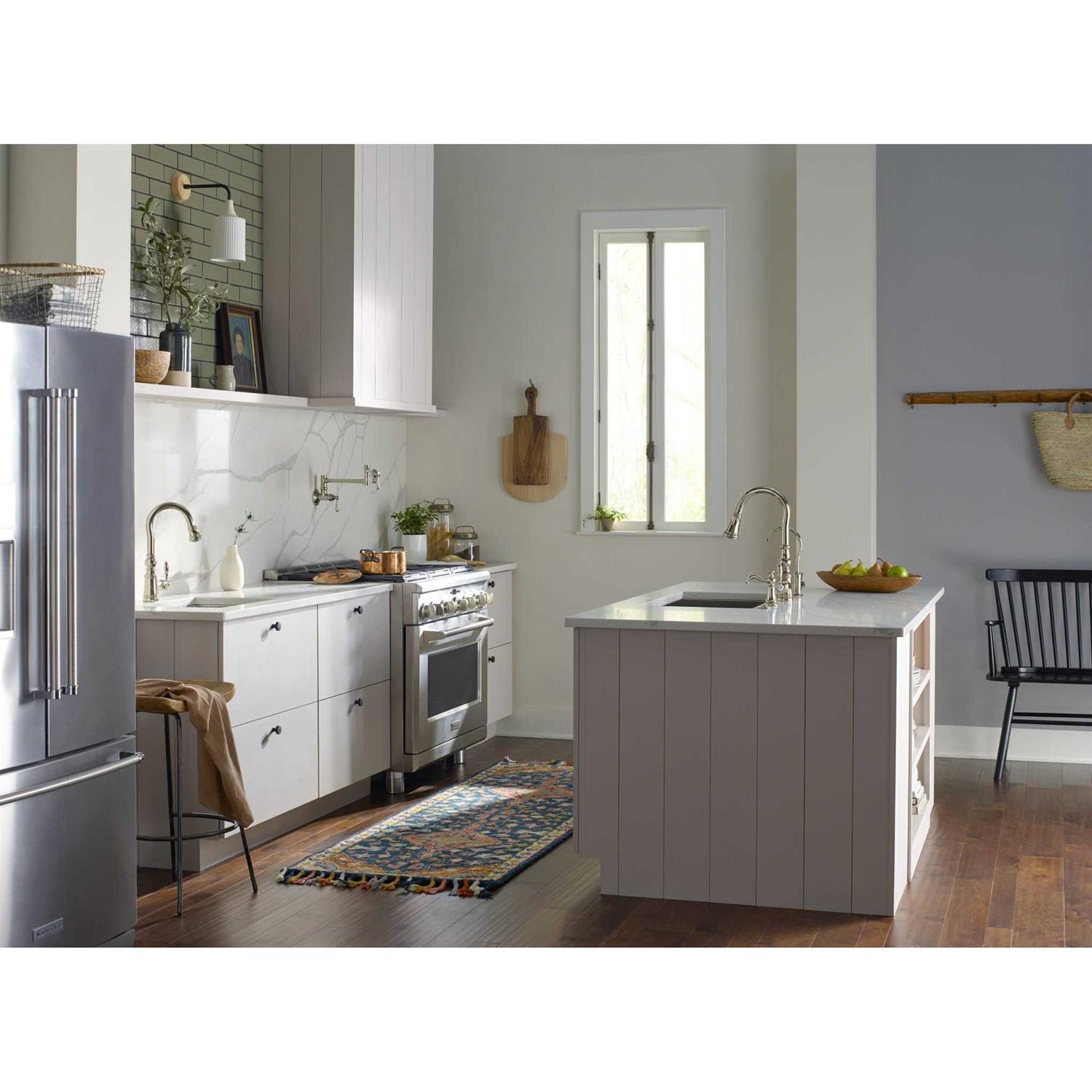 Touch On Kitchen Sink Faucets by Moen. Details:Timeless and full of charm, the traditional Weymouth pulldown kitchen faucet embodies the fresh farmhouse look consumers desire. Its distinctive accents include a refined shepherd’s hook spout and porcelain inlays with antiqued decorative script – both in English and French – to provide the ultimate in customization. The faucet features Moen’s Power BoostTM technology, which provides a faster clean and a faster fill with the push of a button, as well as the Reflex system to ensure smooth operation and secure docking of the spray wand. Available in a Brushed Gold finish.
