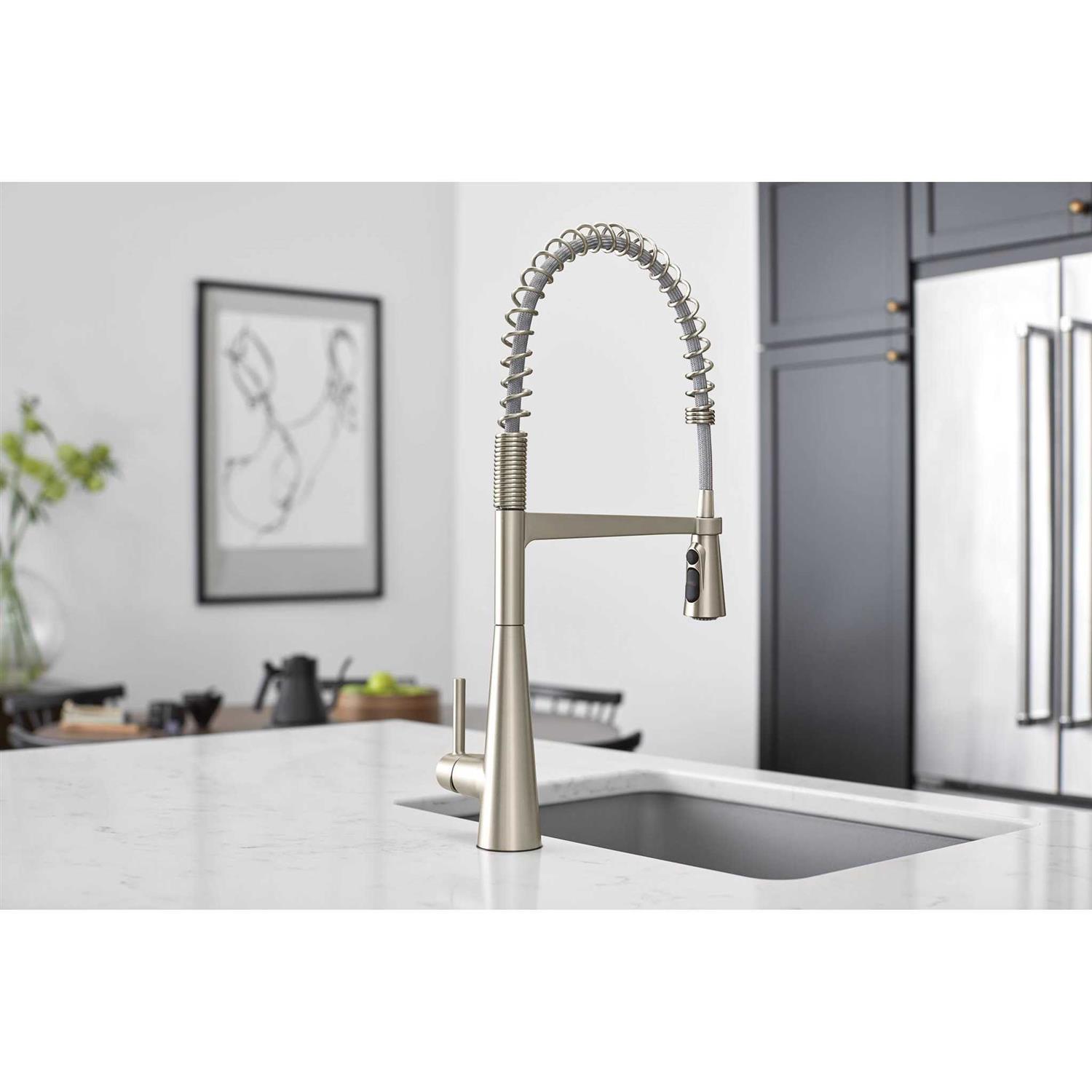 TheMoen 5925BLSis asingle-handle pull-down kitchen faucetdesigned with utmost creativity and perfection. Thishigh arc faucetenables you to clean and fill large pots with ease. It features Moen’sPowerBoost spray technologythat makes filling and cleaning 50% faster with just a push of a button. It also features a retractable pull-down hose that measures 68″ long. Moreover its east-to-match black stainlessfinishmakes this faucet your kitchen’s focal point.This Moen 5925BLS pre-rinse spring pull-down faucet has aspout height of 22-1/2″ and areach of 10″. It consumes1.5 gallons per minuteof use. The cartridge compatible with this Sleek kitchen faucet is theMoen 1255 Duralast.