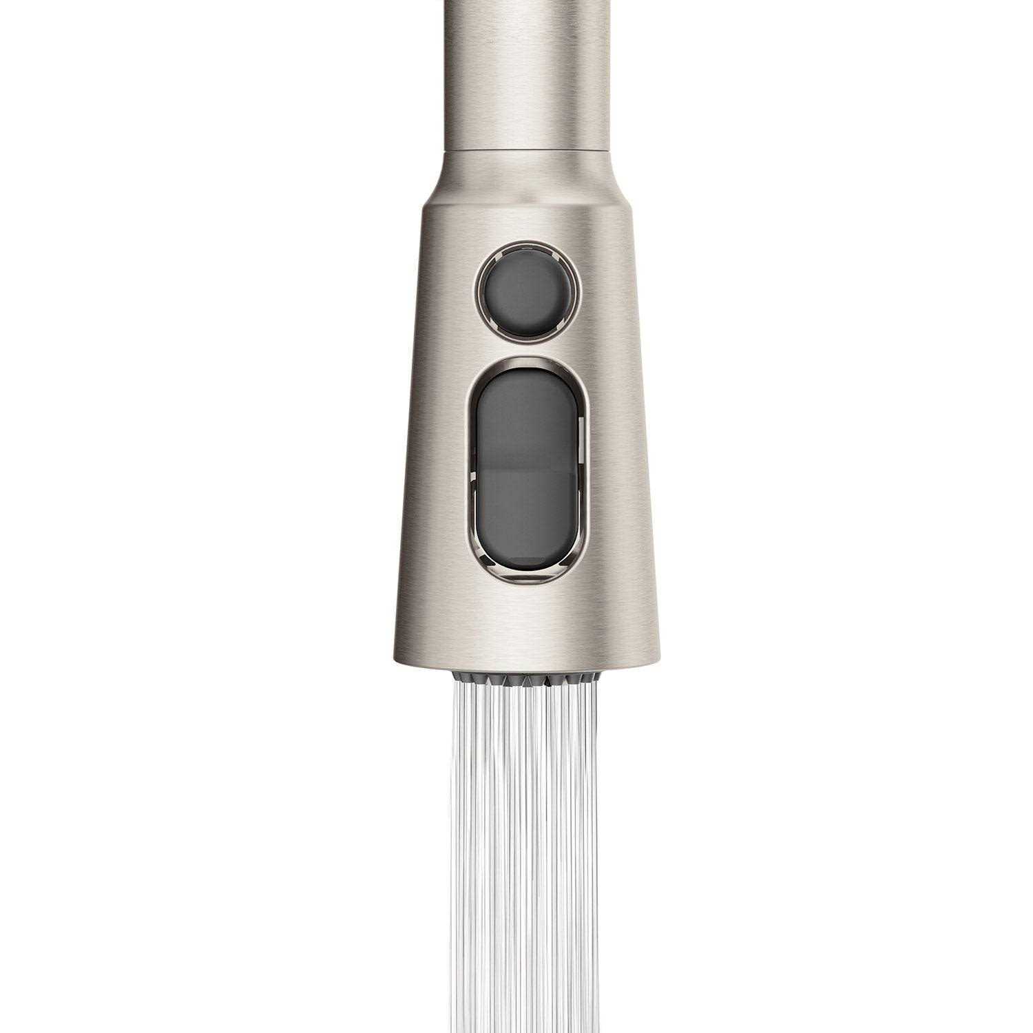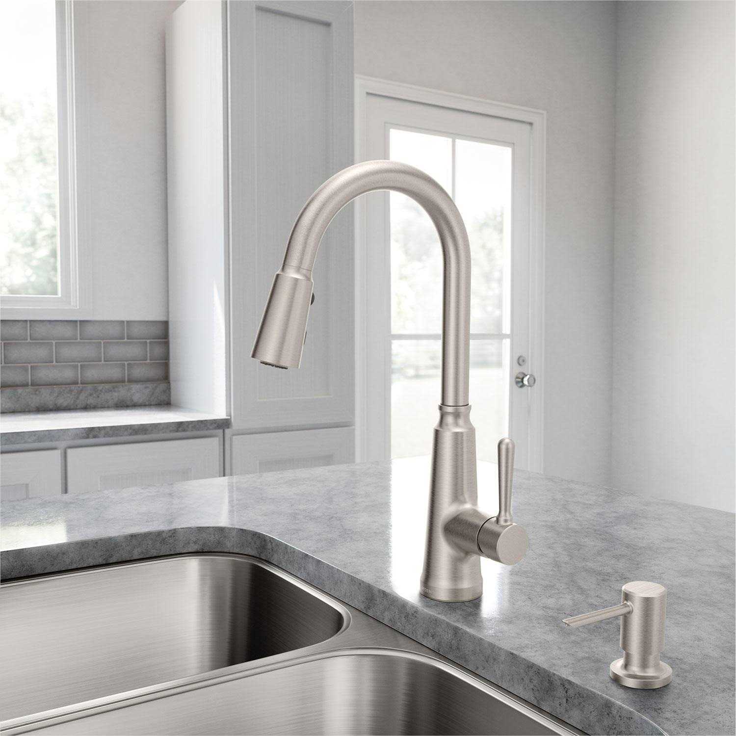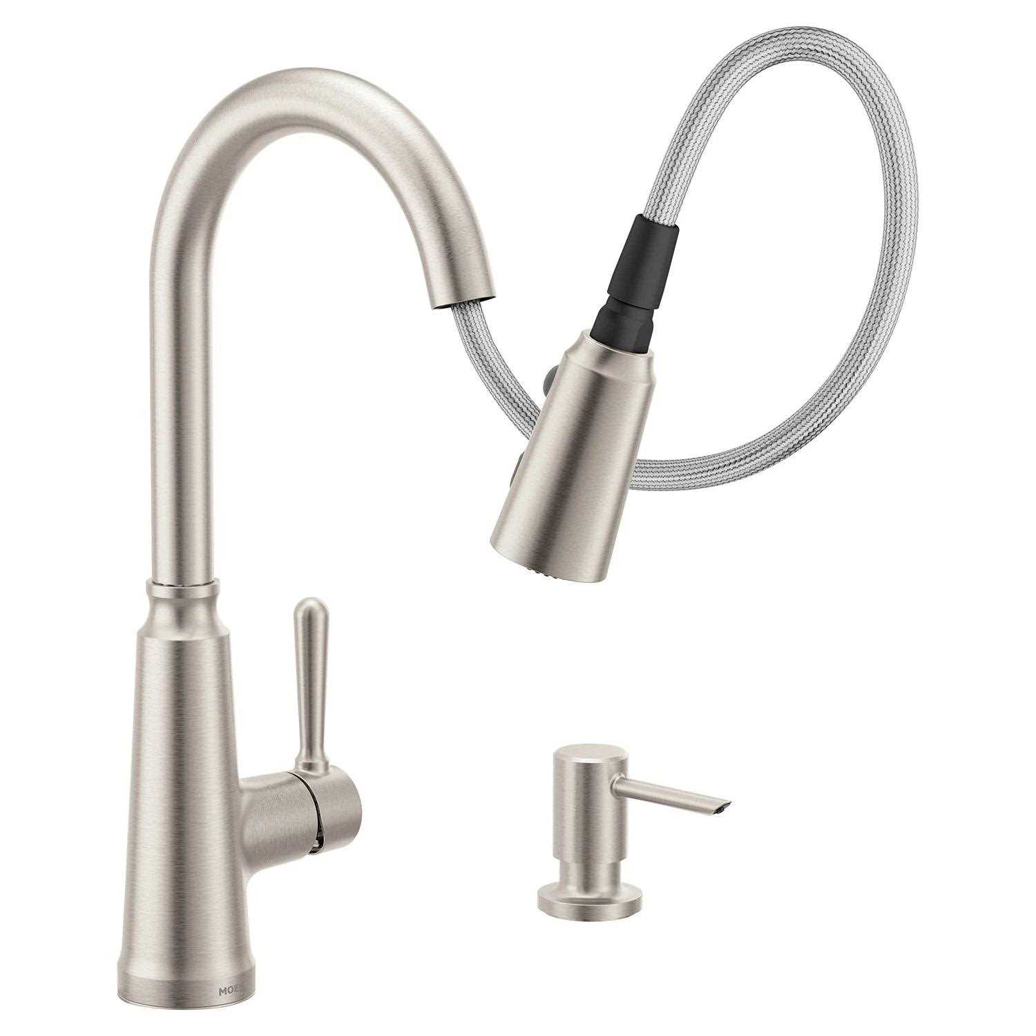 Moen Trew Spot Resist Stainless Single Handle Pulldown Kitchen Faucet From finishes that are guaranteed to last a lifetime to faucets that perfectly balance your water pressure Moen sets the standard for exceptional beauty and reliable innovative design. The Moen Trew Spot Resist Stainless Single Handle Pulldown Kitchen Faucet adds a perfectly balanced design to any kitchen. The pulldown spray head is equipped with the Reflex docking system for smooth operation easy movement and secure retraction. Two spray functions allow you to switch effortlessly between an aerated stream for everyday cleaning and a powerful rinse for heavy-duty applications. The powerful rinse is an exceptionally strong concentrated spray thanks to Power Clean technology. The single-lever design makes it easy to control water temperature and pressure while the high-arc design makes it easy to wash and fill large pots and pans. An optional deck plate (escutcheon) is included. The Moen Trew Spot Resist Stainless Single Handle Pulldown Kitchen Faucet comes with a soap or lotion dispenser and can be installed in 1- 2- 3- or 4-hole kitchen sink applications.