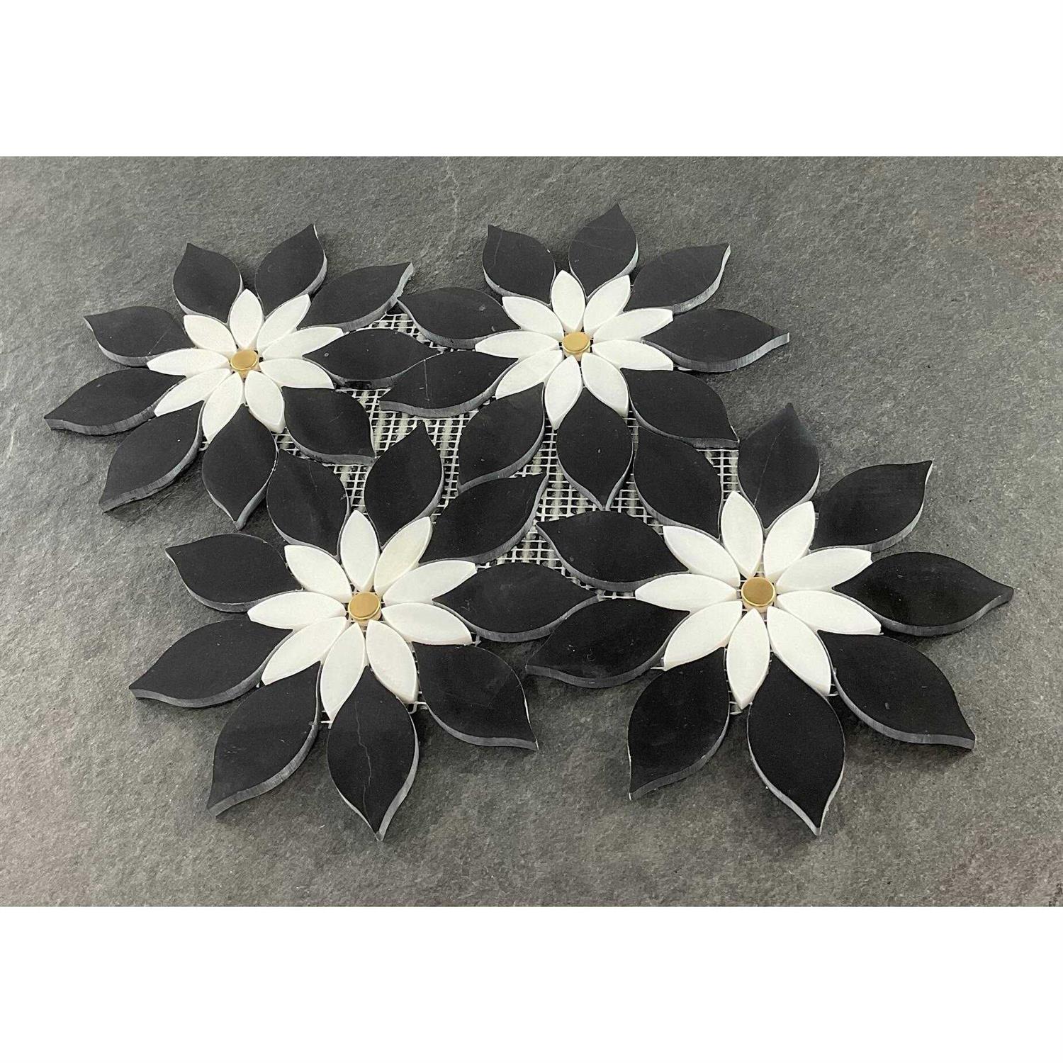 Color: Nero Marquina, White Marble and Gold Metal Overall Product Weight: 4.25 lb. Dimensions Mosaic Sheet: 14.125” W X 12.4” L Individual Tile: Flower Pattern (9″ x 9″) Overall Thickness: 0.31 Surface Area per Carton: 9.17 SqFt It is mesh-mounted for easy installation. Installation Area: Kitchen Backsplash, Fireplace Front, Bathroom Walls, Shower Walls