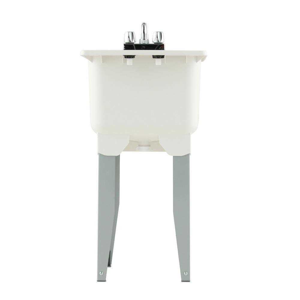 - Includes chrome faucet, 2 supply lines, 1-1/2 in. P-trap, 4 legs, Teflon tape and 1 laundry tub allowing convenient installation