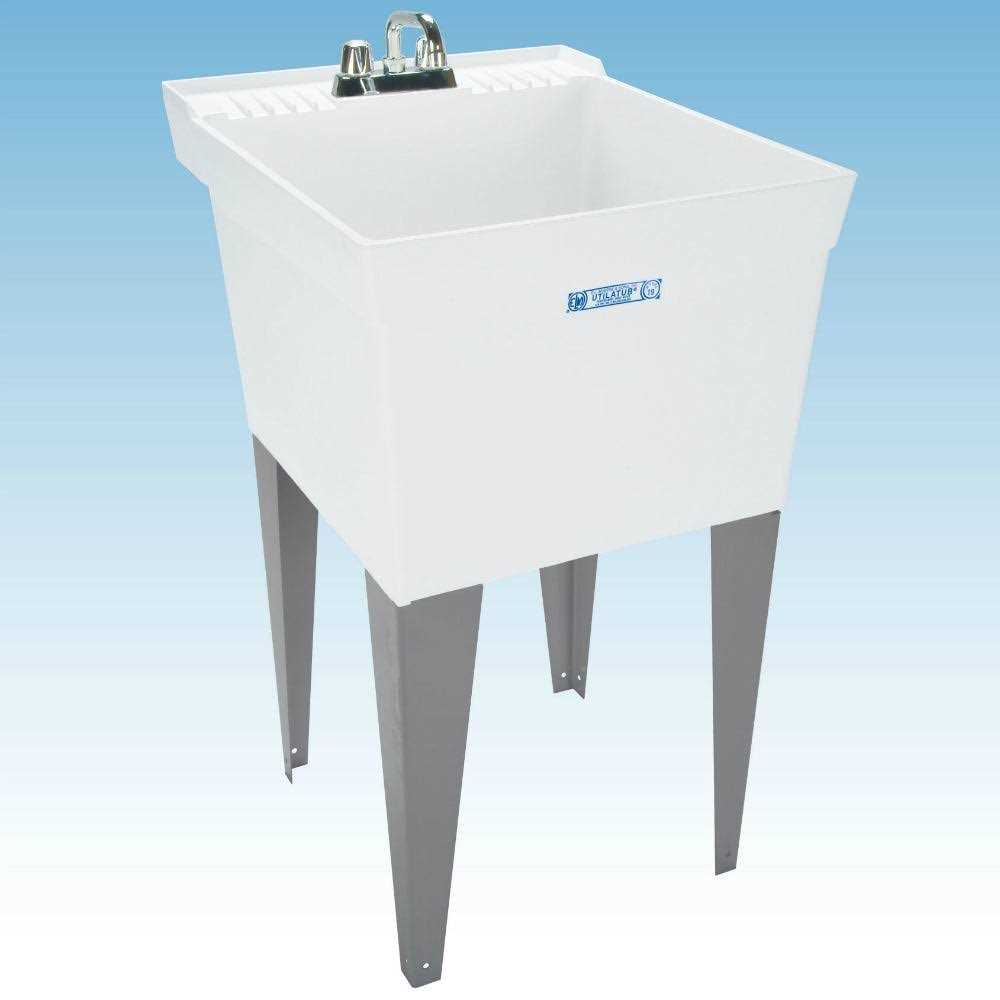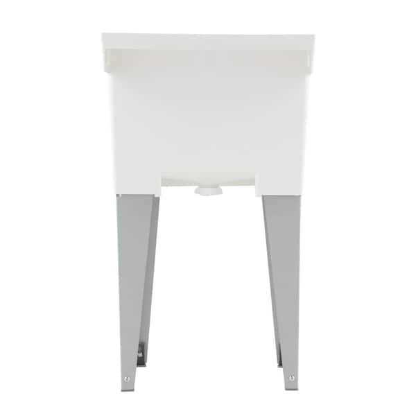 This is a Mustee floor-mount laundry tub in the color white. It is produced with Mustee’s proprietary structural thermoplastic resins and innovative cellular molding process creating extreme strength durability with a 18 gallon capacity tub with a smooth surface. This laundry tub features leak-proof, integrally molded-in drain with stopper and a heavy gauge steel legs with adjustable levelers. Included is a large, self-draining back shelf with retainer curb that prohibits water run-off except into tub. Connects to standard 1-1/2 P or S trap.