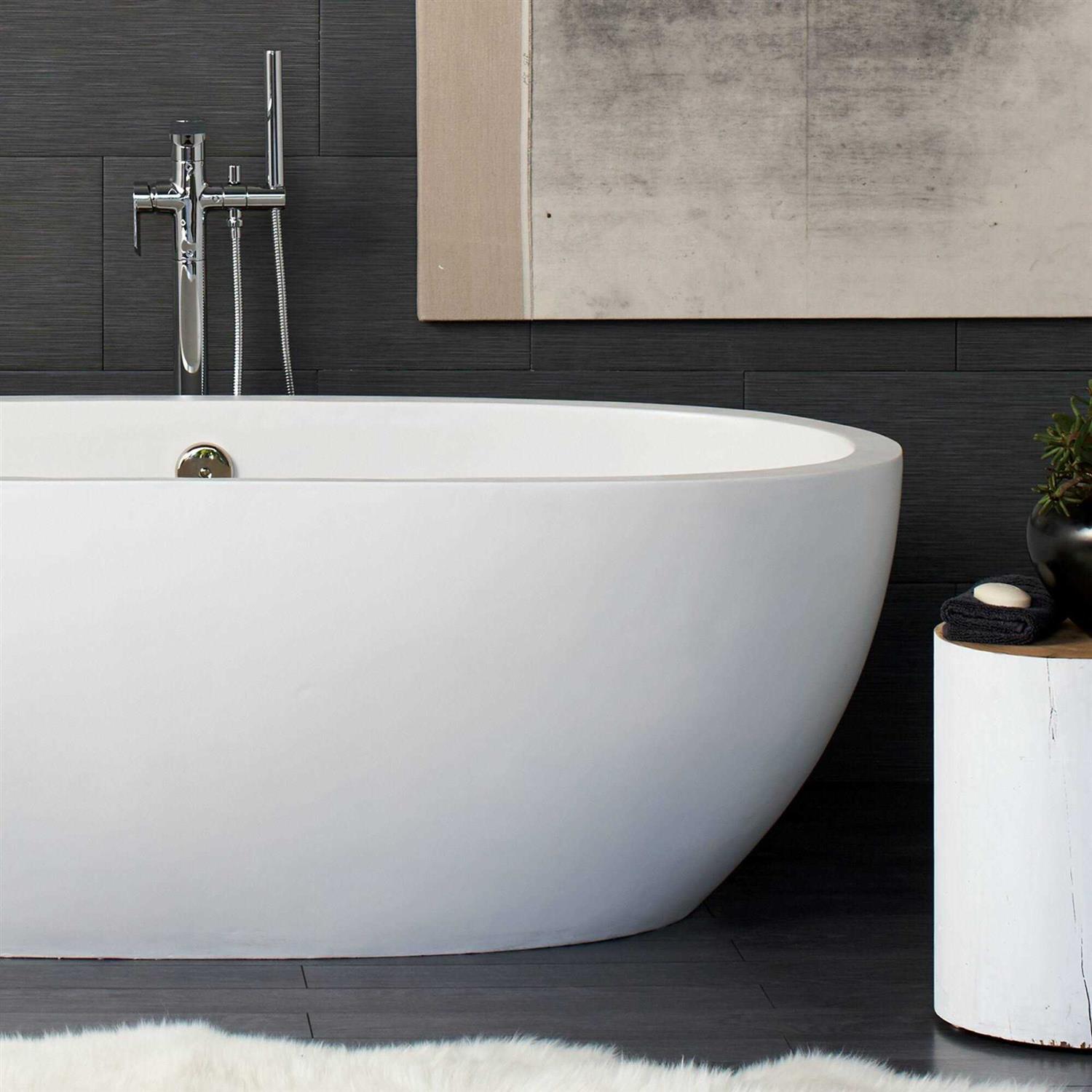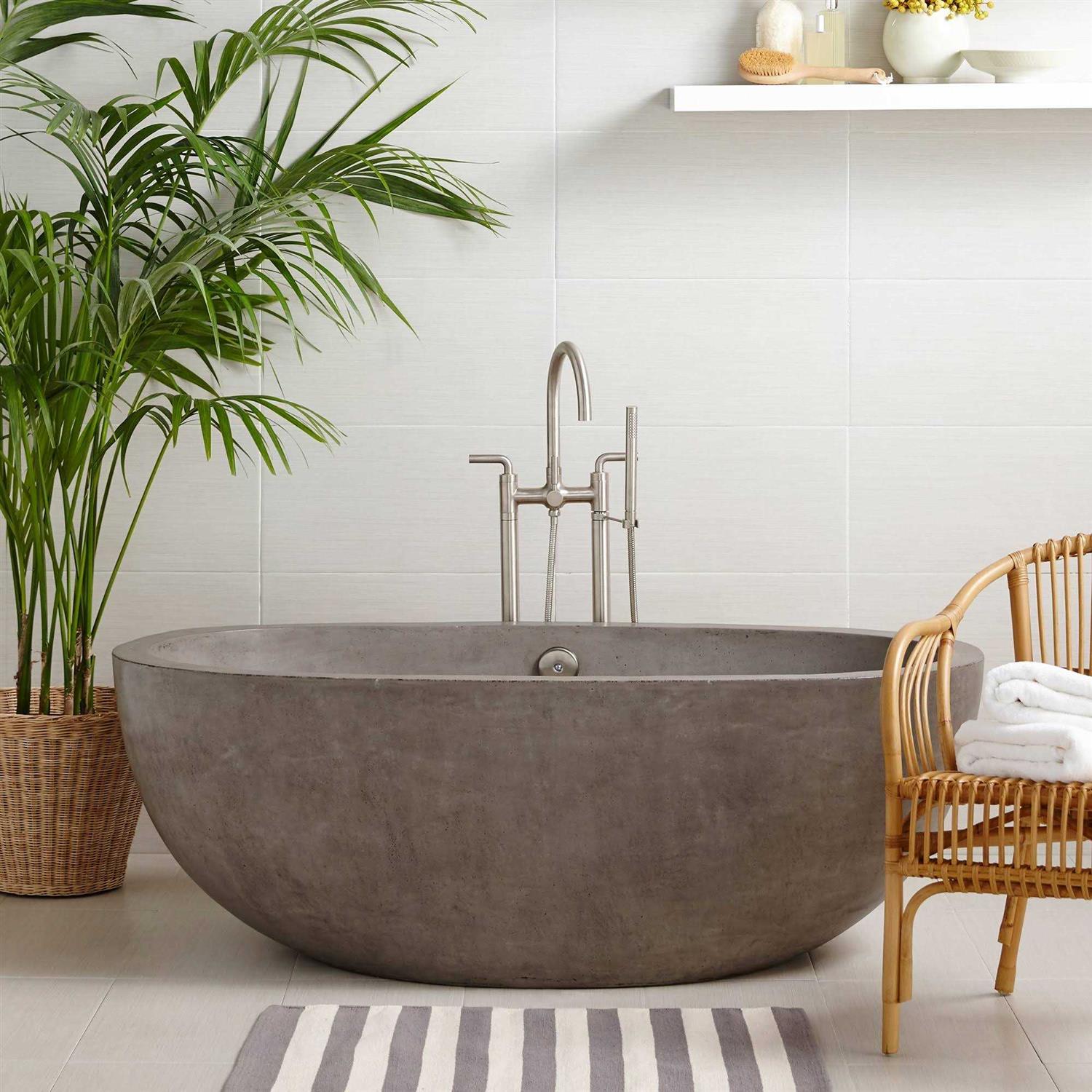 With its perfectly curved form and deep interior, this award-winning NativeStone concrete soaking tub provides breathtaking beauty and optimum comfort. Avalon’s sleek, simplistic lines are muted enough to compliment any design style while bold enough to take center stage in the bath. Made from a combination of natural jute fiber and cement, Avalon is much lighter than a traditional concrete tub. Avalon’s thick walls provide insulation to ensure that a hot, deep, relaxing soak will last. Avalon is available in two sizes: 62 Inch and 72 Inch .