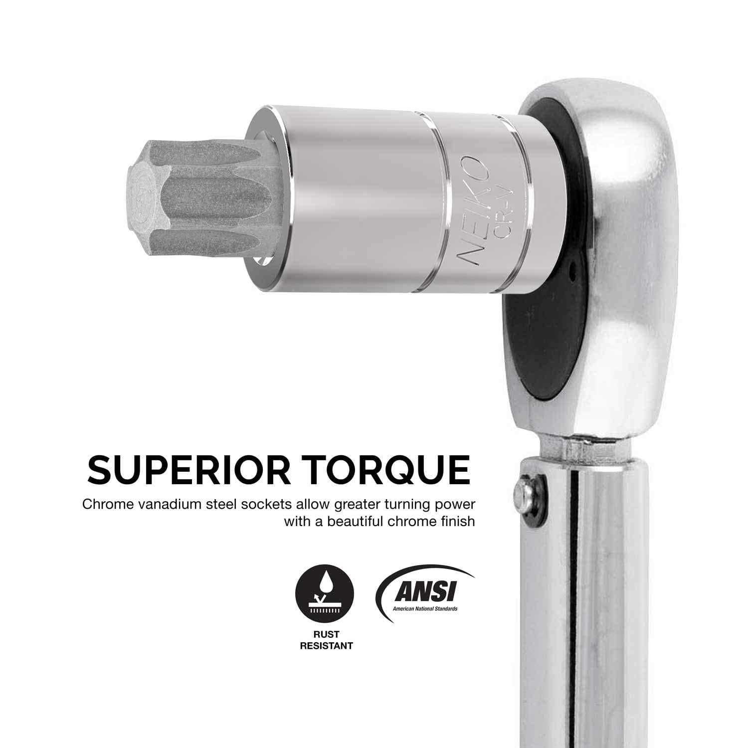 Premium S2 steel bits provide optimal strength and durability to unfasten intractable screws and bit ends are sized for precise fitting. Sockets are made of enduring Chrome-Vanadium. Torque power: This torque socket set is created with strong chrome vanadium steel that provides superior torque for greater turning power with any driver tools. An attached chambered bit helps insert the piece smoothly into fasteners and protects both the bit and fastener from damage and stripping.