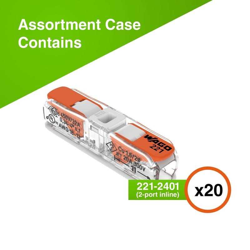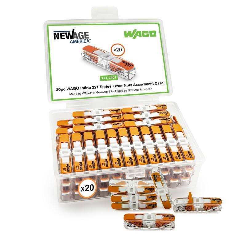 New Age America Wago 221-2401 Inline Splicing Wire Connector Pack | 221 Series Lever Nuts Assortment with Case | Includes (20X) 221-2401