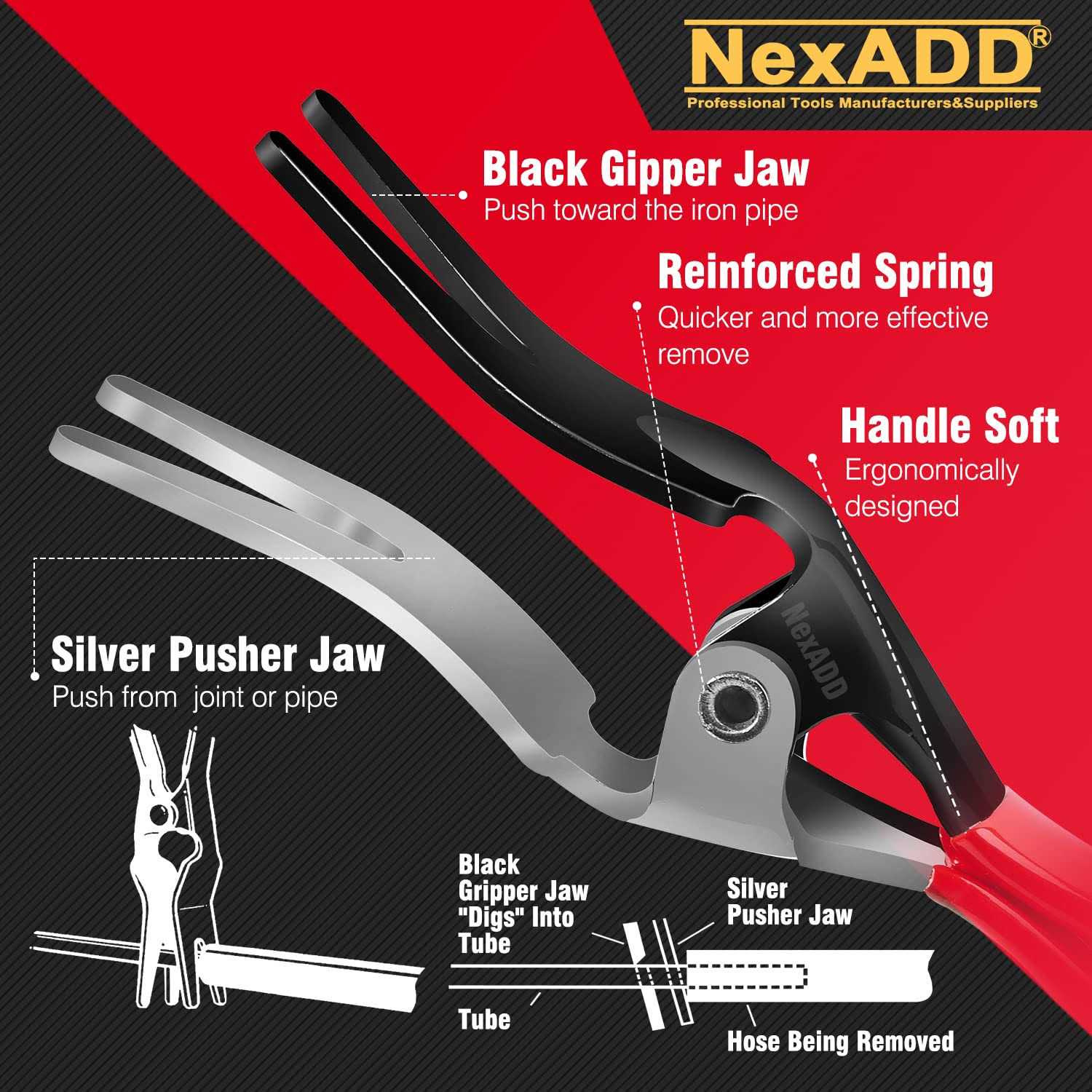 NexADD 4Pcs Fuel Line Pliers Set Does It All – Eliminate the problems associated with removing fuel line connectors or undo fuel lines. – This set includes 4 Pcs fuel line hose pliers,a hose remover pliers, a 9” fuel filter caliper, a hose pipe clamp clip and 80 degree disconnect pliers . Just Add to Cart! Hose Remover Pliers -The best tool for removing hose clamps for fuel and small water hoses. – To remove hoses from transmission,rubber hoses connect to cooler lines. Even if can’t fit both sides (hose/tube)between fitting and hose. – Slide one side in and work hose out then get both sides in, give handles a squeeze and Voila” off comes hose. – Hose remover pliers easily remove stubborn hoses on tanks, radiators, pumps, air cleaners,etc. – Remove fuel vacuum or heater hoses from 5/32”to 1/2”(4mm to 14mm). Fuel Line Clip Removal Pliers -The fuel line clip removal pliers suitable for removal and replacement of connections on fuel filter lines (petrol & diesel). Required when removing and replacing fuel filters. – Upgarded maximum opening approx: 9.3CM/3.66IN.Nex – ADD fuel line clip removal tool suitable for use in large space. – Fuel line hose clamp pliers designed to compress the quick disconnect lugs without damaging connector. – Suitable for VW, Audi, Fiat, GM,Vauxhall,Mercedes and other makes and models. 9″ Length Fuel Filter Calipers – Releasing connections on fuel pipes or replacing fuel filters. – Bent jaws designed for removal and replacement of connections on fuel pipes. – Spring loaded action for easy one-handed operation. – Drop forged high carbon steel for durability,additional black oxide finishing improves corrosion resistance of surface.NexADD 9″ length fuel filter calipers have more uses than line disconnect pliers. – Great for getting clips off damage free on diesel leak off connections too. 80° Bending Disconnect Pliers -If you have used other tools to handle old hardened plugs before, then this 80 degree disconnect pliers will allow you to experience its professionalism. Disconnects fuel line and EVAP line fittings with tabs that Mmust be depressed to disengage. – Compared with needle-nose pliers, the curved jaws are more suitable for operation in narrow spaces and this fuel line disconnect pliers can also protect your hands from injury. NEXADD Fuel Line Pliers Quick Release Remover Best for Removing and Replacing Connections on The Line Fuel Filter Also Some Electrical Connectors