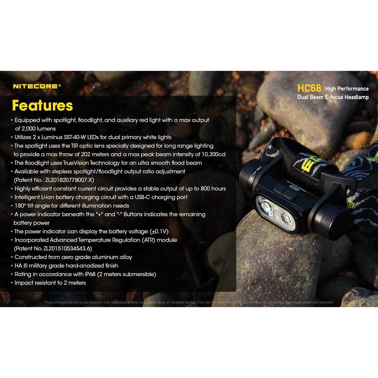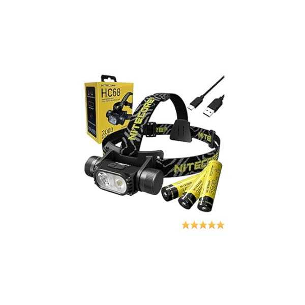 It is available with one hand adjustable spotlight/floodlight stepless adjustment Combined with a user-friendly 3 buttons interface, the 180 all-round adjustable mechanism ensures no blind spots in the outdoor environment Utilizes 2x Luminus SST-40-W LEDs for dual primary white lights Max Output: 2000 Lumens, Max Beam Distance: 202 m, Max Beam Intensity: 10300 cd This is the original factory package which includes 1x High Performance Rechargeable battery Value Bundle: NITECORE HC68 High Performance Dual Beam E-focus Headlamp- 2000 Lumens w/ 2x EXTRA High 3500 Mili Amp Capacity Cell and Eco Sensa Charging Cable /b br br Specifications br br Max Output: 2000 Lumens br Max Beam Distance: 202 m br Max Beam Intensity: 10300 cd br Max Runtime: 800 h 0 m / 33.33 d br LED: 2 x Luminus SST-40-W LEDs br Special Modes: Location Beacon, SOS, Red Caution Light br Beam color: White light, Red Light br Length: 91.5 mm / 3.60 in br Head Size: 26.5 mm / 1.04 in br Weight: 118.5 g / 4.18 oz br Feature: Rechargeable, Spotlight/Floodlight Stepless Adjustment br Activity: Gear, Search, Outdoor/Camping, SAR(search and rescue), Industrial br br br Features br br Equipped with spotlight, floodlight, and auxiliary red light with a max output of 2,000 lumens br Utilizes 2x Luminus SST-40-W LEDs for dual primary white lights br The spotlight uses the TIR optic lens specially designed for long range lighting to provide a max throw of 202 meters and a max peak beam instensity of 10,300cd br The floodlight uses TrueVision Technology for an ultra smooth flood beam br Available with stepless spotlight/floodlight output ratio adjustment (Patent No.:ZL201820778007. X) br Highly efficient constant current circuit provides a stable output of up to 800 hours br Intelligent battery charging circuit with a USB-C charging port br 180 tilt angle for different illumination needs br A power indicator beneath the “+” and “-” Buttons indicated the remaining battery power br The power indicator can display the battyer voltage (0.1V) br Incorporated Advanced Temperature Regulation (ATR) module (Patent No.ZL201510534543.6) br Constructed from aero grade aluminum alloy br HA III military grade hard-anodized finish br Rating in accordance with IP68 (2 meters submersible) br Impact resistant to 2 meters …