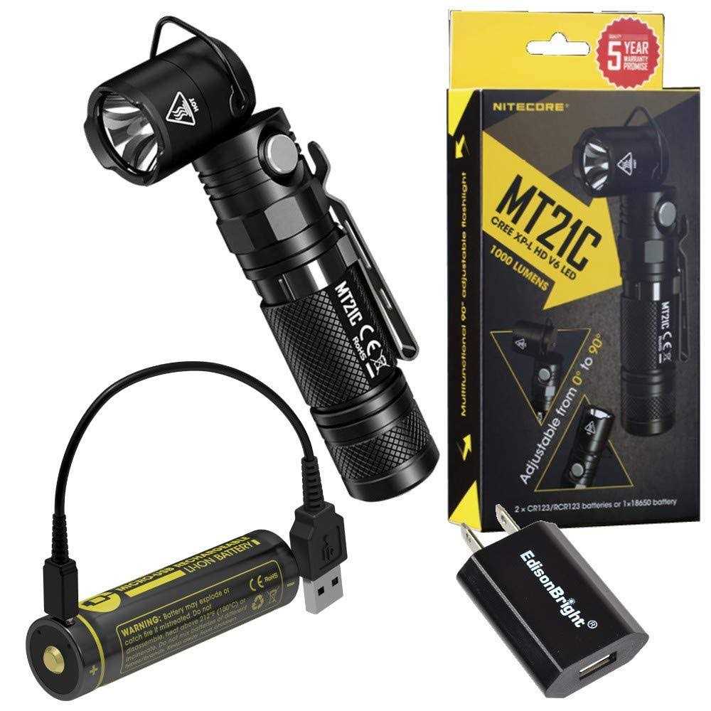 Nitecore MT21C 1000 Lumen 90 Degree Tilt-able Head LED Flashlight, NL1834R Rechargeable Battery with EdisonBright USB Charging Cable Bundle