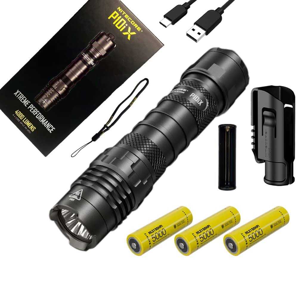 A max output of 4,000 lumens NITECORE 21700 Lion battery included (NL2150HPi 5,000mAh) Intelligent Li-ion battery charging circuit with a USB-C port Incorporated Advanced Temperature Regulation (ATR) module Waterproof and dustproof rating in accordance with IP68 (2 meters submersible) [ SUPER BRIGHT ] Equipped with 4x CREE XP-L2 V6 has a max output of 4000 lumens. [ LONG THROW ] max throw of 158 meters, and a Peak Beam Intensity of 6250, ideal for EDC (Everyday Carry), trekking, camping and more. [ POWER SOURCE ] Powered by NL2150HPi rechargeable battery. The P10ix is an i-Generation Tactical Flashlight designed with the i-generation ultimate revolution.”