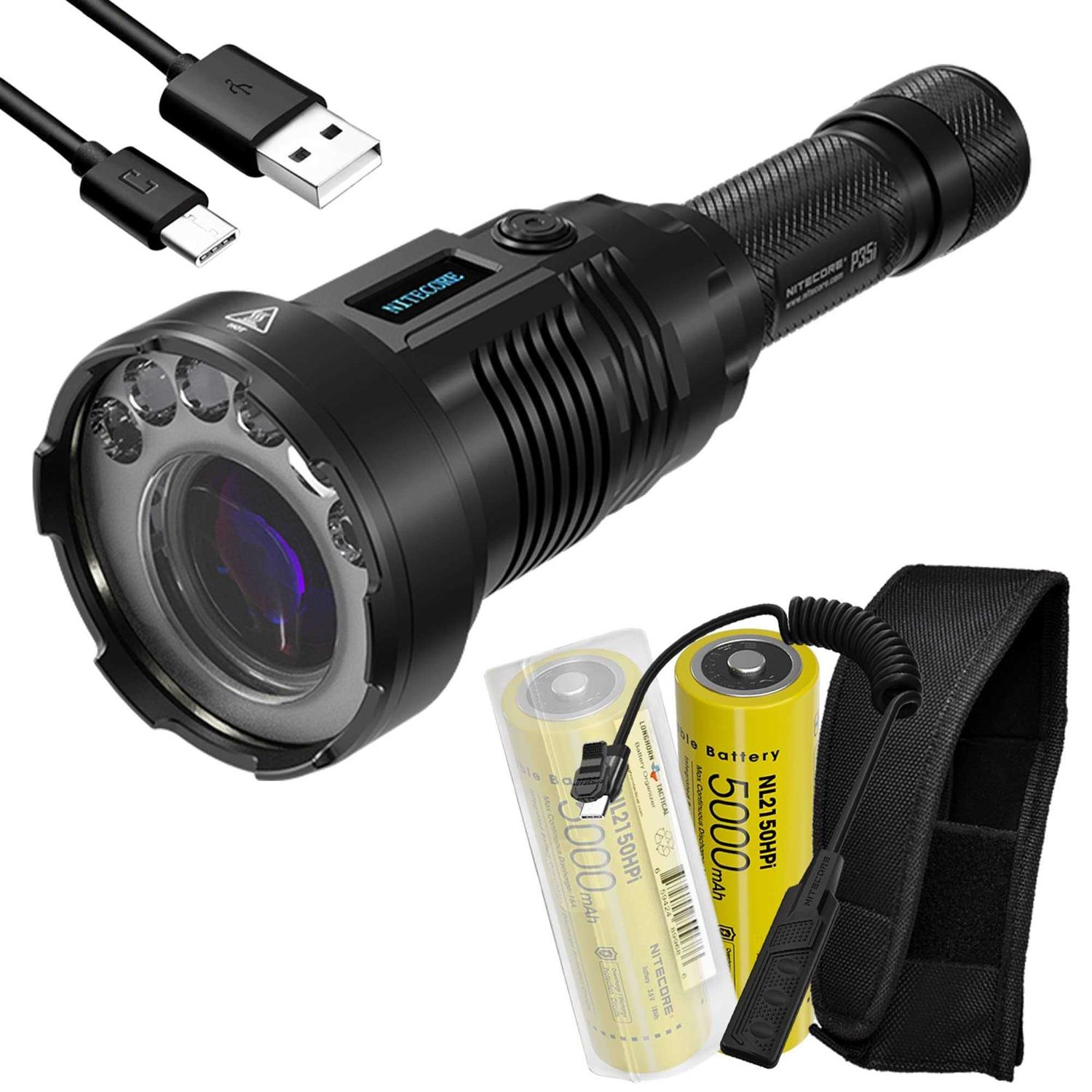 POWERFUL LEP FLASHLIGHT – 3000 lumen max powered by a LEP module and six surrounding LEDs that reaches over a mile in distance also covers the nearfield. USB-C RECHARGEABLE – a protected USB-C port fast charges the flashlight BUILT-IN DIGITAL DISPLAY – real time power level status, remaining runtimes, mode selections, brightness levels, and more. HIGH QUALITY – Built from durable aero grade aluminum alloy and rated IP68 waterproof and 1m impact resistant, great for hunting, search, or exploring. CONTENT IN THIS BUNDLE – a P35i flashlight, 2x NL2150HPi (one preinstalled, one backup in the organizer), RSW2i pressure switch, USB-C charging cable, holster, and LumenTac organizer for safely carrying and storage of spares. Its central LEP module creates a spotlight beam that can reach up to 1,804 yards, longer than 18 football fields! Combining the six surrounding flood LEDs, it produces a 3000 lumen max beam that covers both areas closeby and faraway. In your palm is a searchlight that can reach over a mile in distance, great for hunting, search and rescue or spelunking. br br The P35i is USB-C rechargeable. Built-into the side of the P35i is an OLED panel giving you detailed power level readings, remaining runtimes, mode readouts, and more. The protected USB-C port can also be used to connect the included RSW2i pressure switch for remote control when the flashlight is mounted. The P35i is made from durable aero grade aluminum alloy and is rated IP68 waterproof, ready for outdoor adventures. br br Specifications: /b br * LED: 6x CREE XP-G3 br * Maximum Brightness: 3000 lumen br * Peak Beam Distance: 1840 yards br * Peak Beam Intensity: 678000 cd br * IP Rating: IP68 br * Impact Resistance: 1 m br * Brightness & Runtimes: br ++++ Turbo: 3000 / 45min br ++++ High: 1000 / 2hr br ++++ Mid: 300 / 6hr 45min br ++++ Low: 70 / 28hr br ++++ Ultralow: 10 / 60hr br * Dimensions: L-7.36″xW-2.56″xH-1″ br * Weight: 10.46oz br br