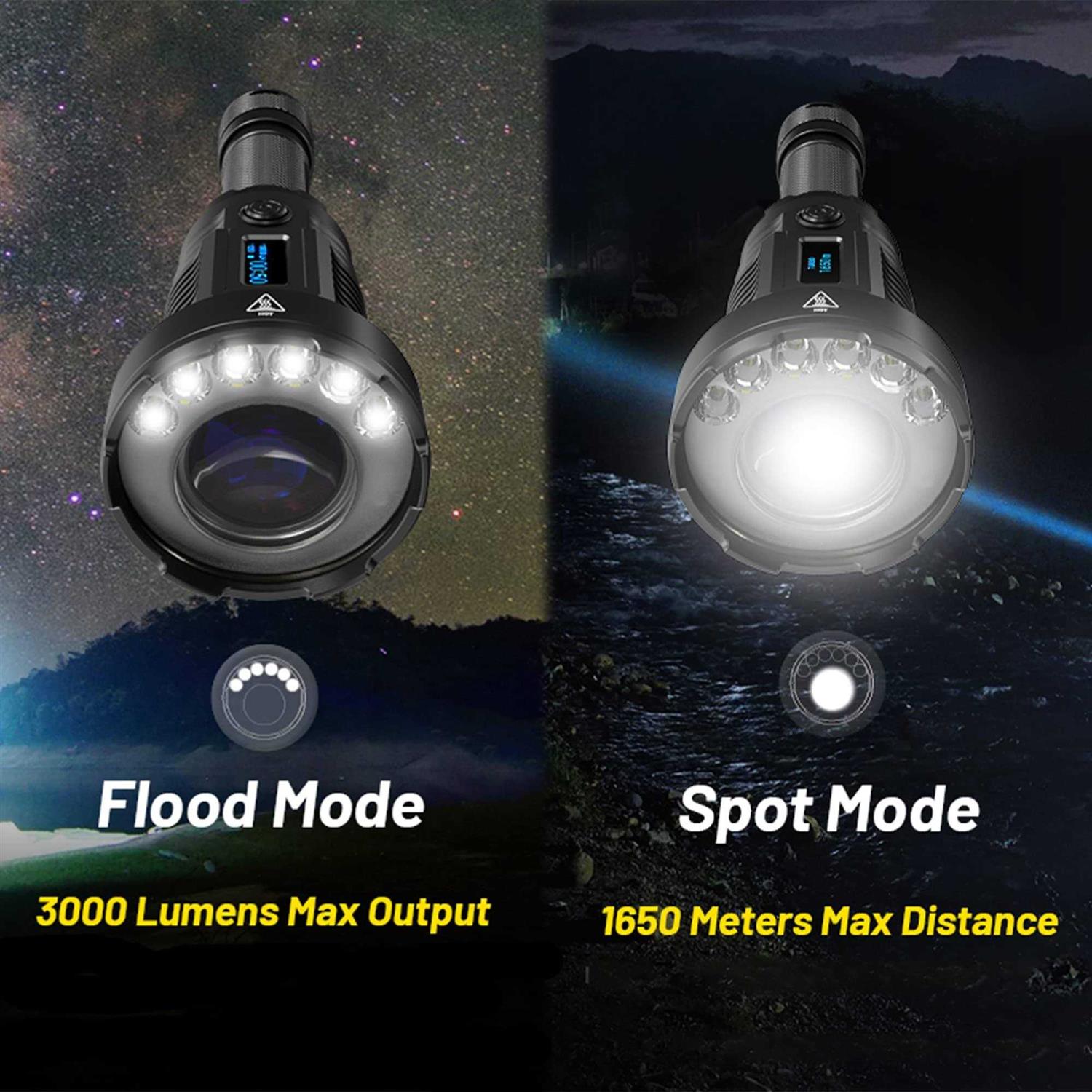 • 3000 lumen max powered by a LEP module and six surrounding LEDs that reaches over a mile in distance also covers the nearfield. USB-C RECHARGEABLE