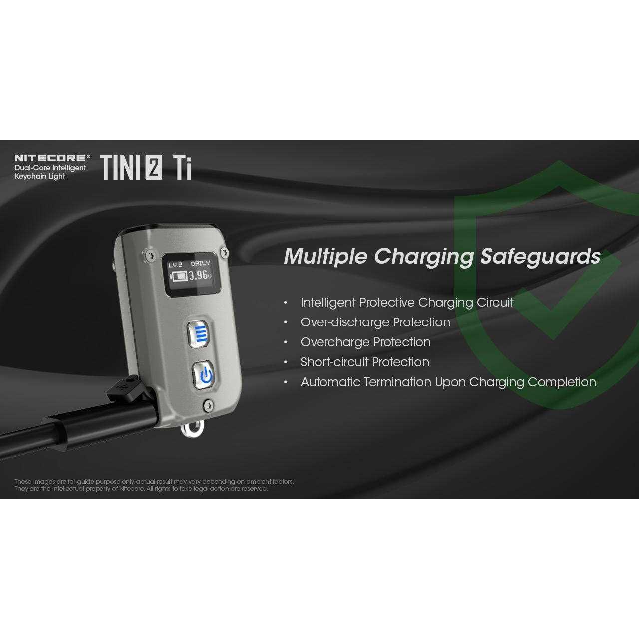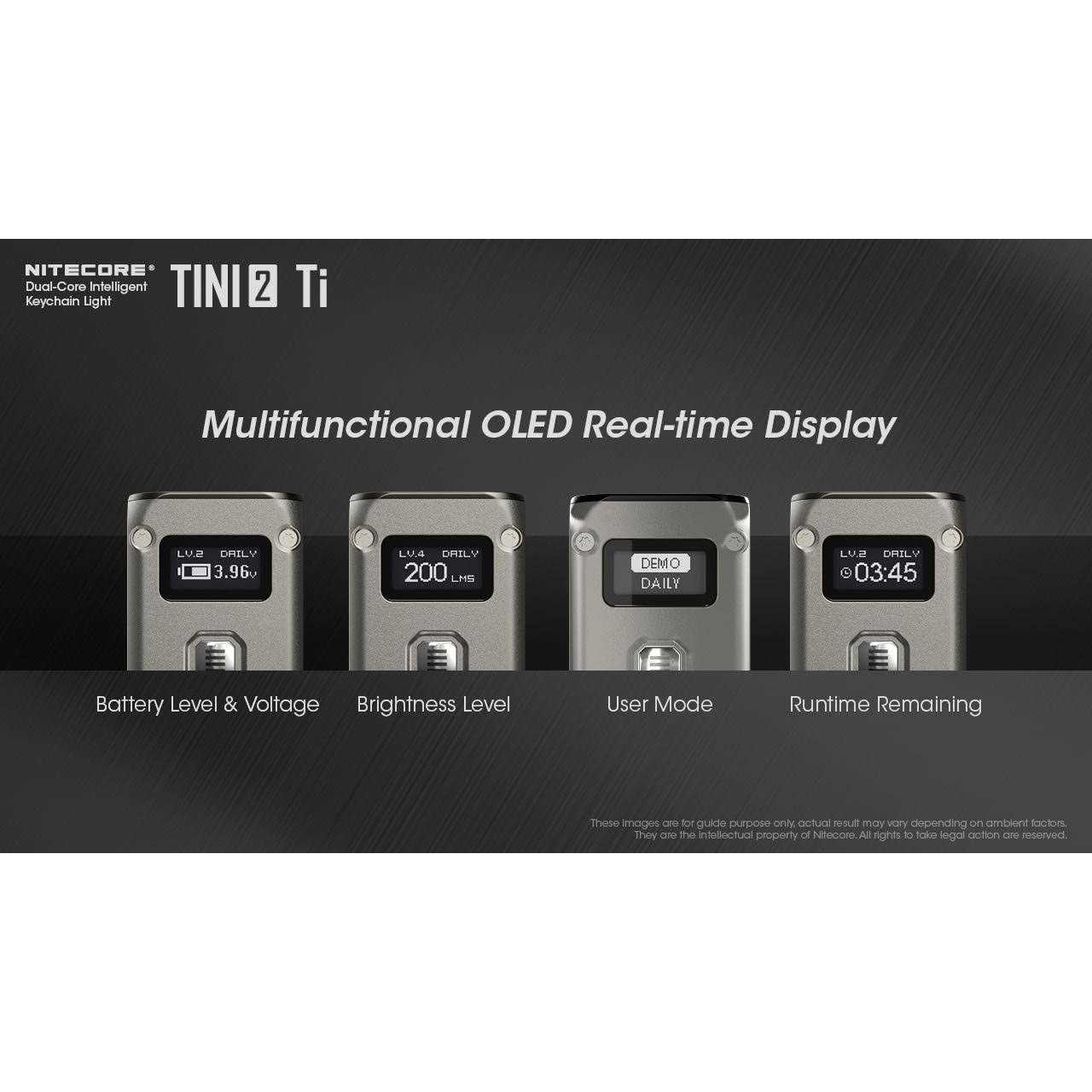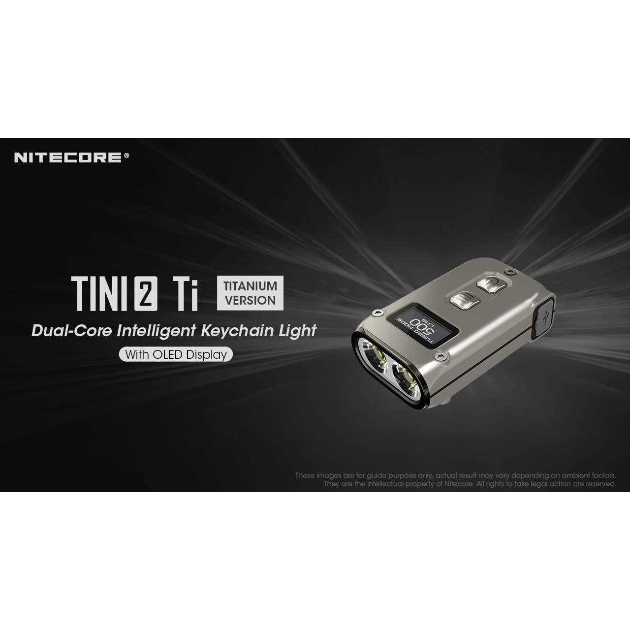 Rechargeable LED Keychain Light: This light is powered by a rechargeable lithium-ion battery for long-lasting use. Dual-Core Design: The light features two LEDs with 500 lumens each for bright illumination. Titanium Finish: The light has a durable titanium casing that is impact resistant. Easy to Use: The light is designed as a keychain for convenient carrying and access. Fast Runtime: With 60 hours of runtime on a single charge, it provides long-lasting illumination. Nitecore TINI-2 Ti Titanium Dual-CoreRechargeable LED Keychain Light – 500 Lumens w/ FREE Eco Sensa Type C USB Cable /b br br Specifications: br br Max Output 500 Lumens br Max Beam Distance 89 m br Max Beam Intensity 2000 cd br Max Runtime 60 h 0 m / 2.5 d br LED 2 x P8 br Battery Rechargeable Li-ion br Length 46.6 mm / 1.83 in br Head Size 12.5 mm / 0.49 in br Weight 26 g / 0.92 oz br Feature Rechargeable br Activity Outdoor/Camping, EDC br br br Features: br br Utilizes 2x P8 LEDs with a max output of 500 lumens br Max peak beam intensity of 2,000cd and max throw of 89 meters br Utilizes a total reflective optic lens for uniform and soft light br Multifunctional OLED real-time display for lumens, battery voltage and runtime, etc. br Built-in battery br Advanced Power Cut-Off (APC) technology for an ultra-low standby power consumption br Built-in battery with a USB-C port br Highly efficient constant current circuit provides a stable output up to 60 hours br 2 user modes available (DEMO mode and DAILY mode) br Dual side switch design br 5 brightness levels available with direct access to TURBO. br Inteligent mode memory function br 2 lockout modes available (Half Lockout Mode and Full Lockout Mode) br Incorporated Advanced Temperature Regulation (ATR) module (Patent No. ZL201510534543.6) br Metal ring pull able to withstand up to 30 kilograms of weight br Impact resistant to 1 meter. …