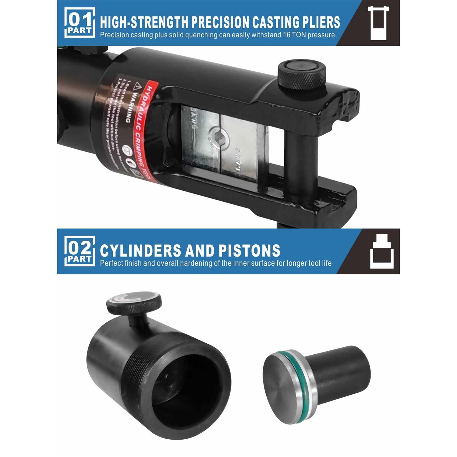Hydraulic crimping tool specification: Crimping range 10 AWG-4/0 AWG, Stroke 5.6Inch Hydraulic crimping tool 10 pairs of hexagon crimping dies: 10.9.8.6.4.2.1. 2/0 . 3/0. 4/0AWG 【Wide Application】 The crimper tool is great for battery and welding cables , power Wires , and electrical cables ,even can be rotated 180° freely for narrow space working. 【Comfortable grip】 The vinyl-dipped grip is very comfortable and easy to use and Wont slip 【Easy operation】The mold can be easily replaced by one-way fixed latch