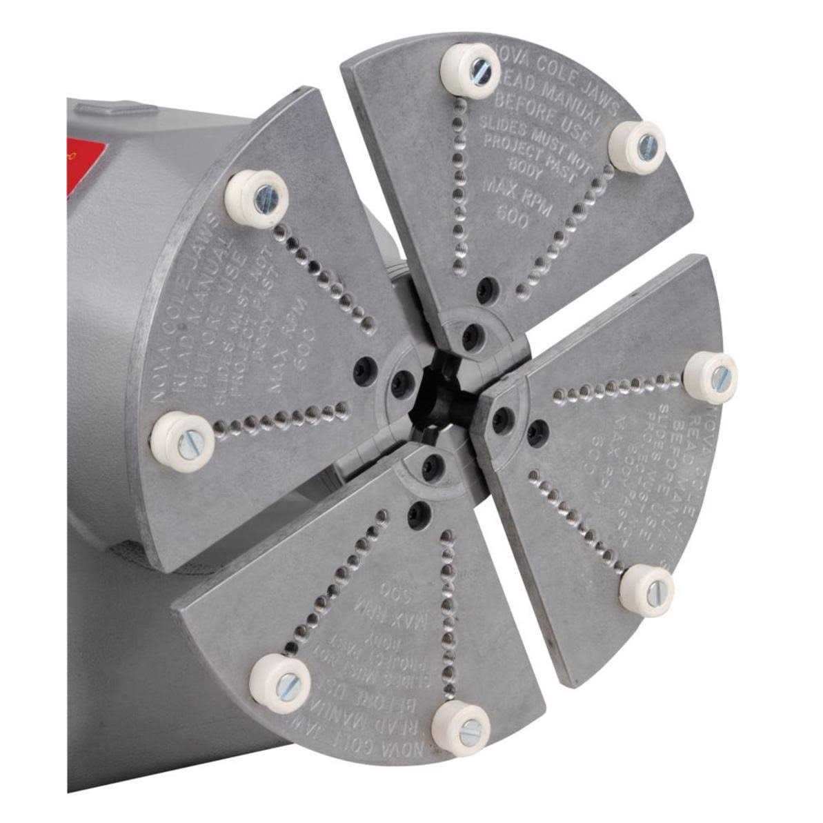 NOVA JSCOLE Cole Chuck Accessory Jaw Set is an accessory for NOVA Chucks, designed to expand your range and capacity of your standard NOVA Chuck for specific projects and applications. Universally fits to any NOVA Chuck* for maximum flexiblity, saving money as duplicate accessories are not needed for different NOVA Chucks. Other NOVA Accessory jaw sets can be added to the Cole Jaws making a combination jaw facility – expanding dovetail facility for mounting bowls/platters and a reverse dovetail for mounting footed bowls/platters. These jaws have many advantages over traditional vacuum chucking. Suitable for lathes with a minimum 12 inch swing diameter. Diecast aluminium with pre-set holes, for precise closing, durability and long life. Comes with 4 jaw segments, special fasteners, standard rubber bumpers and instructions. Additional accessory bumpers are available. Designed by the innovators of the 4 Jaw Chuck for wood turning, Teknatool International – since 1955. *Some accessories such as larger jaws are only suitable for use on the larger NOVA Chucks, please check manual prior to use.