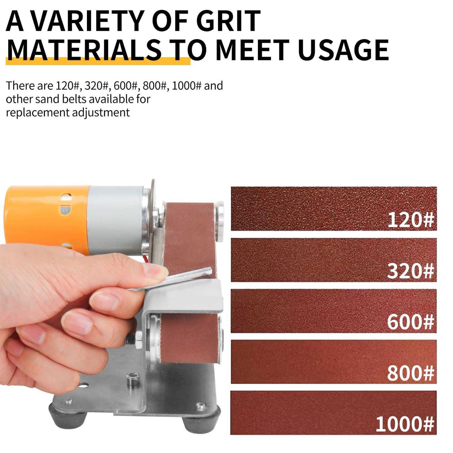 Brand: NuoDuncoColor: Model.2 Knife Making Plus KitFeatures: 【Slope Model】: As you can see the sanding belt surface is in the shape of a slope, the angle of inclination is 15 degrees, this design is ideal for making the knife edge sharp. 【Plus Kit】: By installing a grinding wheel and a buffing wheel on the left and right side of the belt sander, a mini bench grinder with sanding belts can be built up quickly, and with the speed adjustment function it will be a super tool for jewelry making, resin artwork, and knife making. 【Speed Adjustment】: Sliding the slider on the power adapter can achieve 7 gears of speed switching, from the lowest to the highest speed switching is very convenient, press the button next to the power supply can also switch the sand belt forward and reverse. 【Sturdy Body】: The whole structure of the mini belt sander is made of heavy-duty stainless steel with 4 anti-vibration rubber feet at the bottom, which is excellent for use at home or in the outdoors. 【Powerful Motor】: All copper motor with high torque, strong power and low noise. Can reach 4000 to 9000 rpm in a minute, can cope with a variety of needs including metal, jewelry, plastic resin, knives, etc. EAN: 0720707245060Package Dimensions: 8.3 x 7.8 x 7.2 inches