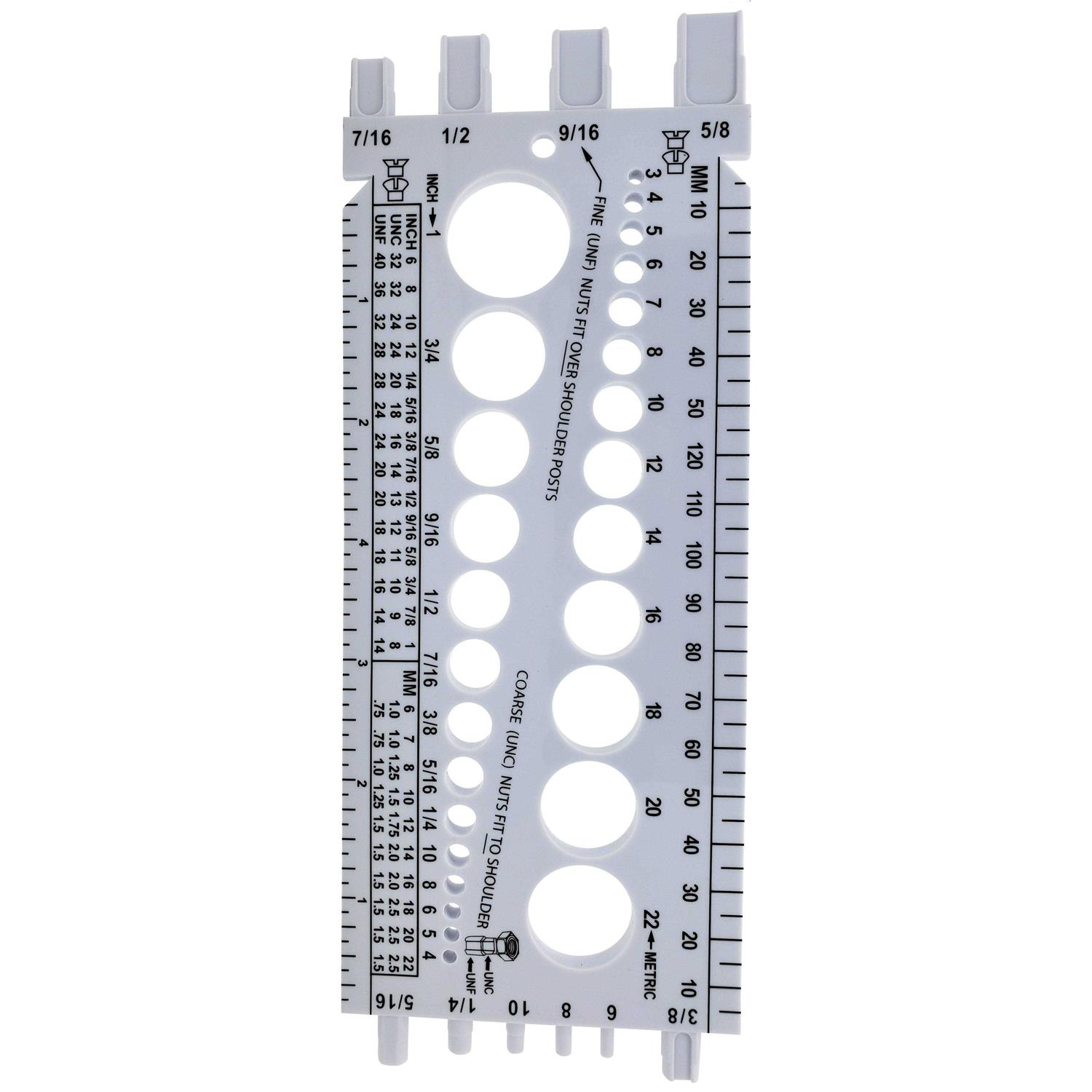 Quickly and accurately measure nuts, bolts, screws and washers Features a ruler marked with inches and millimeters USS, SAE, & Metric Constructed of 1/4 inch thick hard plastic for lasting durability Smooth easy to clean surface that resists oil and grease US & metric thread pitch gauge included on the reverse side. Age Group: adult.