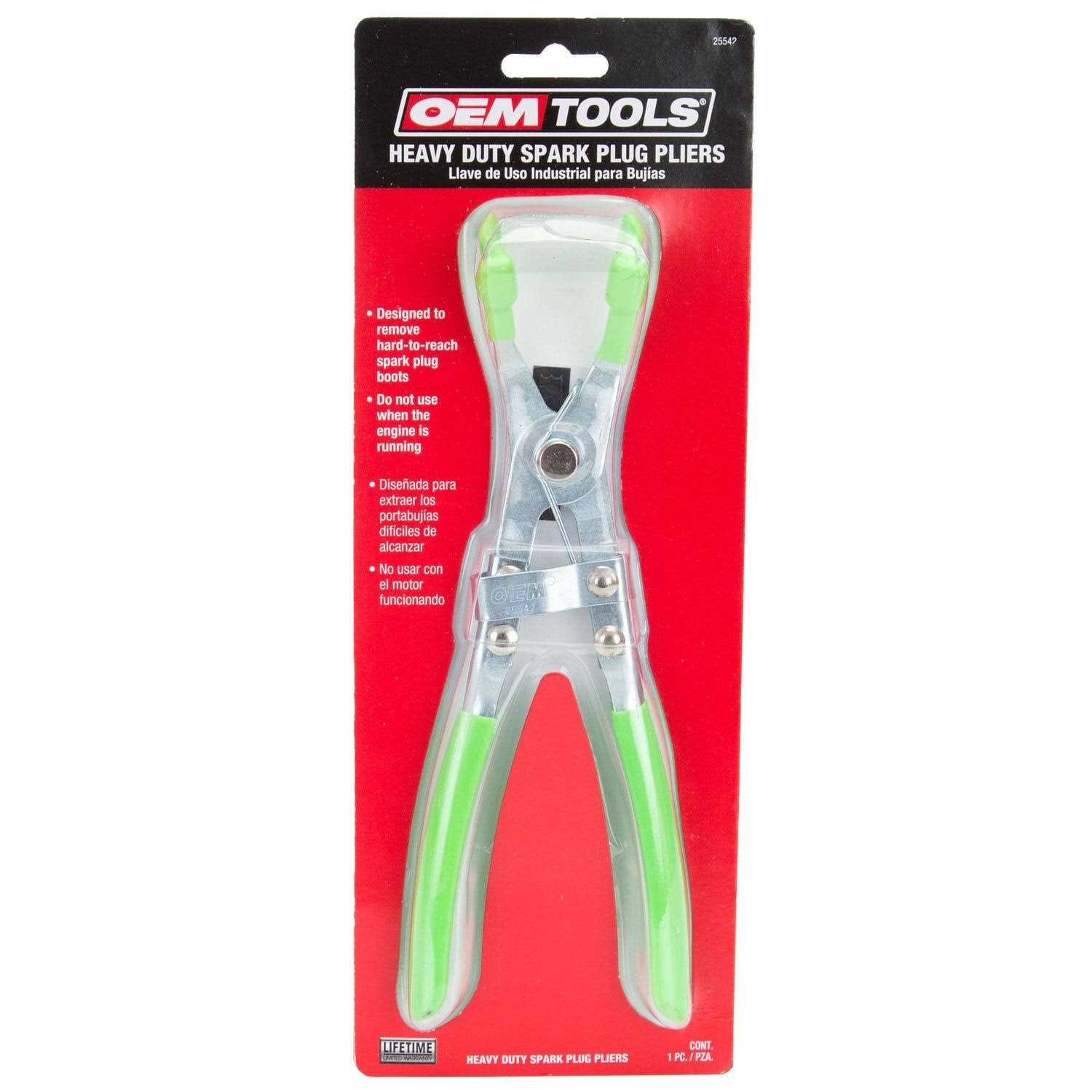 The OEMTOOLS Spark Plug Pliers are designed to remove hard-to-reach spark plug boots. These pliers have a 45-degree offset jaw and vinyl coated grip for easy wire and boot handling.