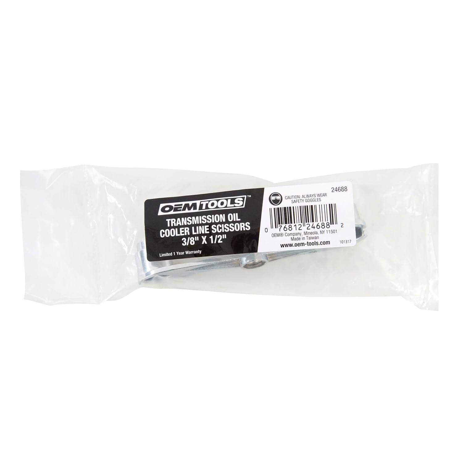 The OEMTOOLS 24688 Transmission Oil Cooler Line Scissors are ideal for disconnecting 3/8\ and 1/2\ transmission oil cooler lines found on Ford and Cadillac vehicles.