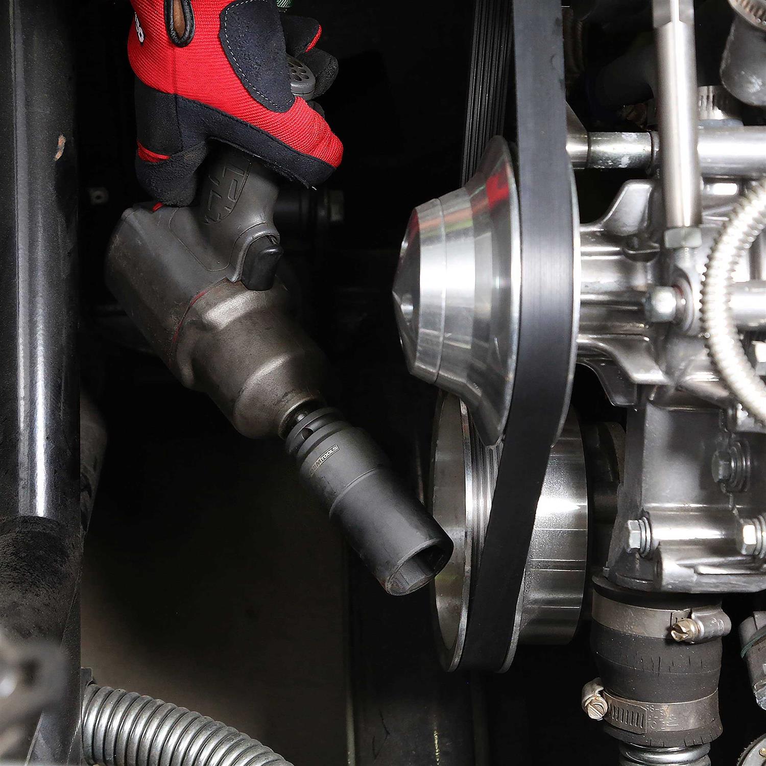 - Deep, counterweighted harmonic balancer bolt socket with 6 points of contact provides increased torque to break loose the most stubborn crank bolts