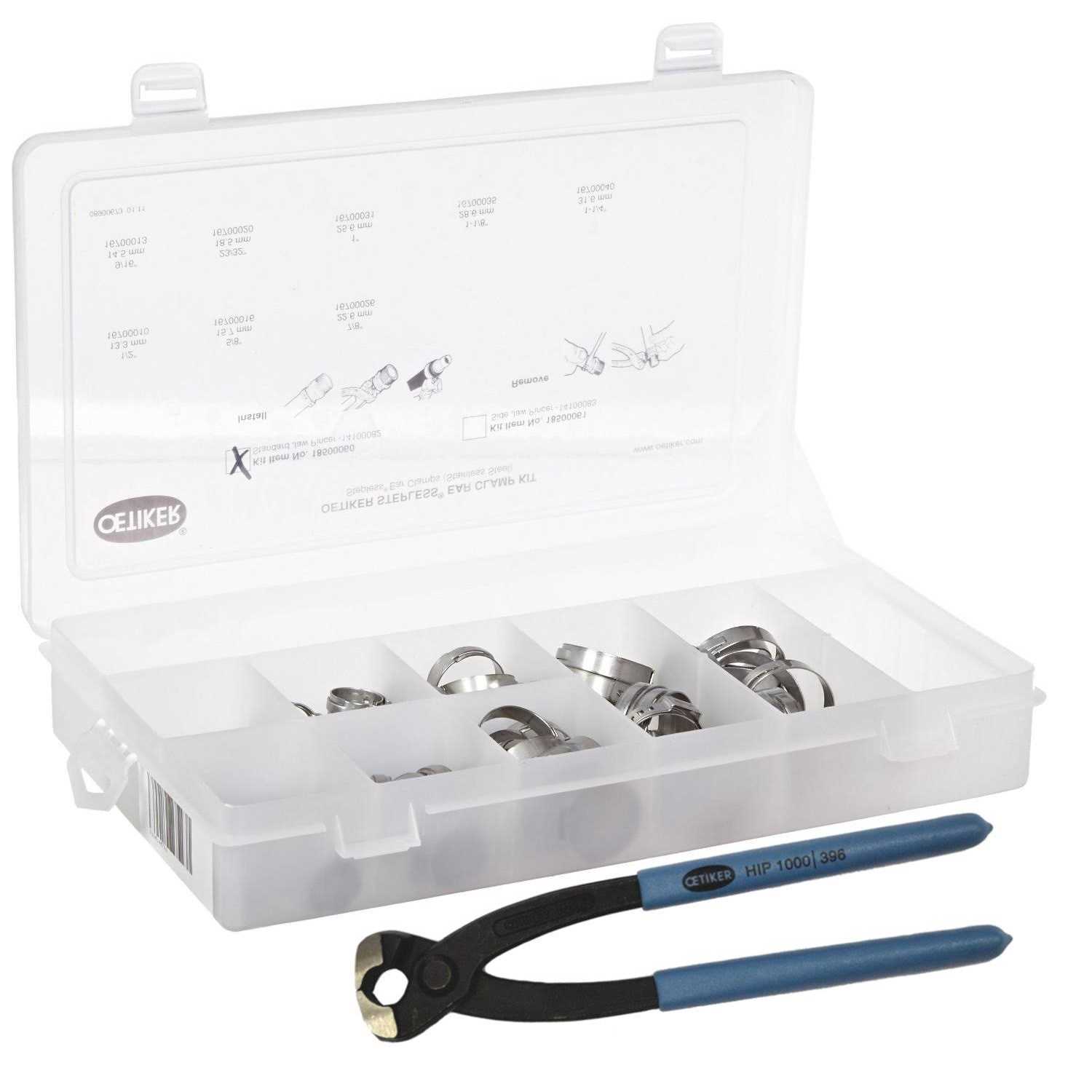This Oetiker 18500060 StepLess one-ear clamp kit contains stainless steel StepLess one-ear clamps and a pair of standard jaw pincers for clamping hose clamps in a variety of diameters. The dimple or indentation on the ear of the clamp increases the clamping force for a more secure hold, and the mechanical interlock of this clamp keeps it securely closed and provides better corrosion resistance than a spot-weld, which is vulnerable to corrosion. The ear clamps are stainless steel for resisting scaling and corrosion for at least 1000 hours of exposure to salt spray in compliance with Deutsches Institut fr Normung-English International Organization for Standardization (DIN EN ISO) standard 9227. This clamp kit is suitable for attaching a variety of hoses to fittings or other devices in various industrial applications, such as heavy machinery, hydraulics, irrigation, food processing, automobile manufacturing, and petroleum industries, among others. Hose clamps attach tubing and hoses to fittings to prevent flow leakage, or are used for hose or wire mounting applications. They come in a variety of designs to distribute uniform pressure over the circumference of hoses to bind them to fittings. Other hose clamp types are used for mounting, strapping, clamping, and positioning hose or wire. Hose clamps are suitable for a large number of industries, and commonly used in industrial, electronic, and automotive applications. Oetiker manufactures hose clamps, rings, couplings, conveyor chains, hinged belts, and other connecting parts and accessories. The company, founded in 1942 and headquartered in Horgen, Switzerland, meets International Organization for Standardization/Technical Specification (ISO/TS) standard 16949. Whats in the Box?