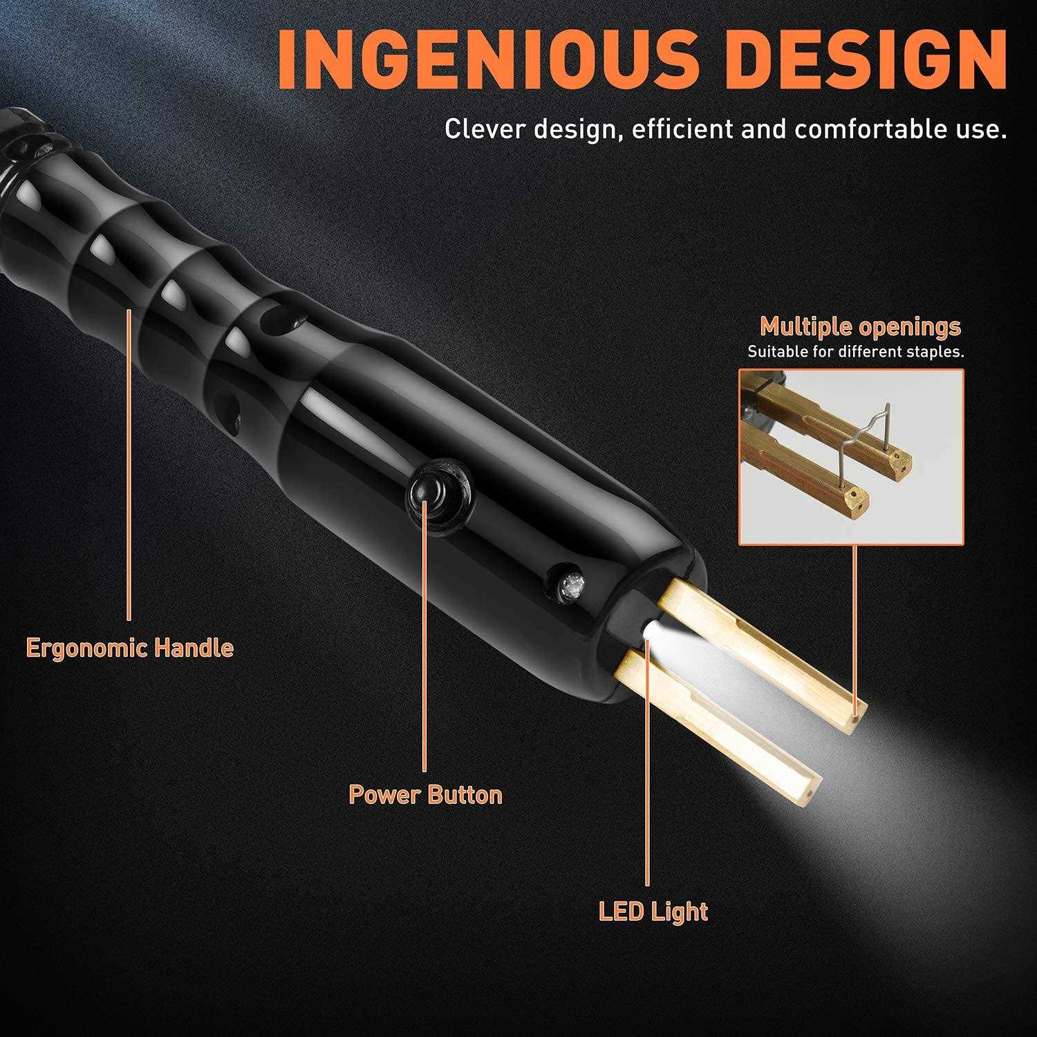 OIMERRY Plastic Welder Hot Stapler with 800pcs Staples, 110V Bumper Plastic Repair Welding Kit Save your time and improve the weld experience when using this 30W Hot Stapler Plastic Welding Kit with 5 adjustable heat levels to weld the cracked and damaged plastic parts. This plastic stapler gun with LED indicator will let you quick and easy to repair the broken and damaged plastics of automobiles, motorcycles, ATVs, boats and industrial applications. Bumper Welding Kit heats special staples, and perfectly welds staples and plastic together while still remaining flexibility of plastic. 1x Hot stapler unit, 1x Cutter, 1x Triangle electrode, 1x Power line, and 800pcs staples all included in one suitcase, easy to use and carry. The hot stapler have acquired the CE and FCC Certifications.