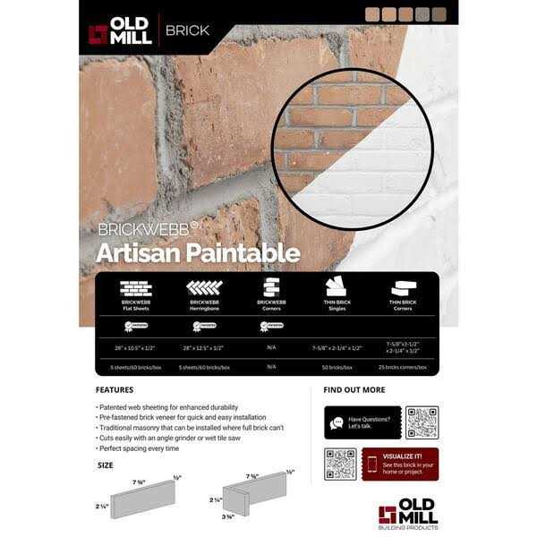 Old Mill Brick Single Thin Brick Flats are made from the highest quality genuine kiln fired clay brick. Single Thin Brick is designed for quick and easy do-it-yourself installation. Artisan Paintable is a pigment free brick designed and produced to be painted using standard masonry or limewash paint. The brick color is subject to varied and frequent change. Simply apply adhesive to the back of each thin brick and apply to virtually any surface. They are perfect for unique designs, custom spaces and can be used by themselves or in conjunction with Brickwebb or Old Mill BrickPanel.