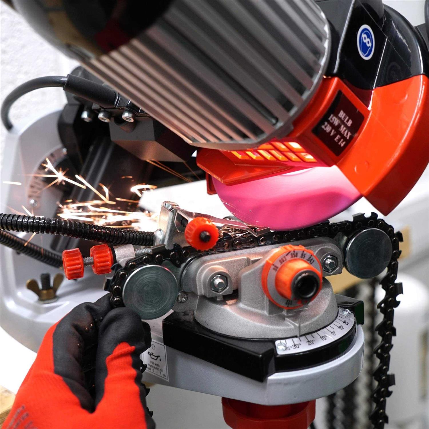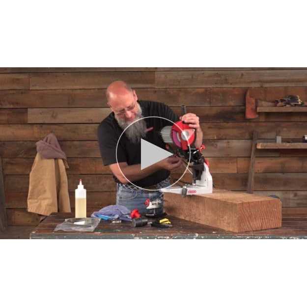 Built-in light. Self-centering chain vise and customizable vise handle positioning. Hands-free clamp vise operation for faster grinding. Sharpens 1/4″, 3/8″ low profile, 0.325″, full profile 3/8″ and. 404″ pitch chain.