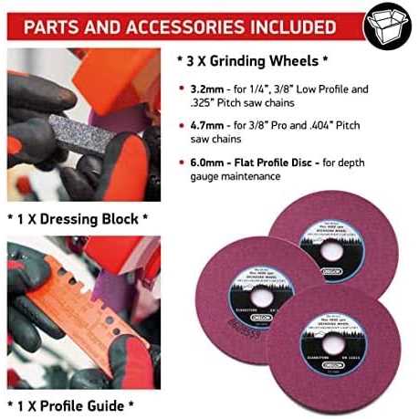 - Universal sharpener: Sharpens up to .404” pitch chain. Sharpen almost any saw chain from manufacturers such as Oregon, Stihl, Husqvarna, and others.