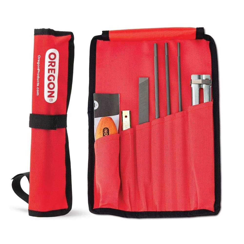 Keep your tools sharp and effective whether in the workshop or out on a job with the Oregon Universal Chainsaw Field Sharpening Kit. Made for on-the-go sharpening, this kit has everything you’ll need to keep your chainsaws, pole saws, and other tools in great working order. It includes three round saw chain files ranging from 3/16 to 7/32, a 6-inch flat file, a file guide for easy depth gauge setting, and a universal handle to fit all included files. This chainsaw sharpener kit comes with a detailed instruction sheet, including a filing chart that will help you select the right filing tool and technique for consistently great results. The instructions have their own carry pouch for easy storage and access. All items in this kit fit neatly into a compact rolled pouch with a loop closure made of durable canvas material, making it easy to carry from job to job and keep close to hand whenever you need it.