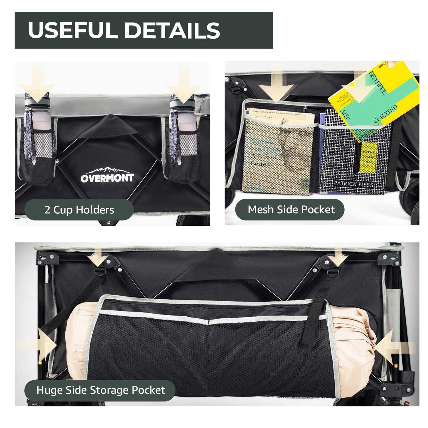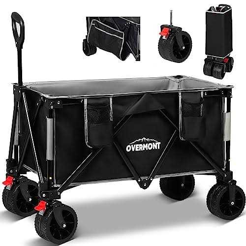 Sufficient Storage Space – The extended dimensions of the Overmont trolley are 90 x 58 x 51 cm and provide enough space to store items. Thicker, tear-resistant oxford fabric increases durability and can be easily disassembled and cleaned. 【360 Swivel Wheels & Adjustable Handle】360 swivel front wheels allow this trolley to move smoothly on any terrain, and the adjustable handle design can accommodate people of different height for comfortable use. Multiple angle adjustment makes it easy to pull, maneuver and use the trolley. 【EXCELLENT LOAD CAPACITY】Our folding trolley is built with a sturdy steel frame that can hold up to 120kg. The removable wheels are wider than other folding trolleys, and the extra wide 10cm wheels feature a unique non-slip pattern, making it easy to cross different terrains, including beaches, lawns and even uneven surfaces. 【Extra Storage Space】Overmont portable four-wheel camping cart comes with a large side storage bag and 2 easy-access cup holders that provide 20% more storage space than other cars. Suitable for camping, BBQs, shopping mall, hiking to the park, beach or sporting events. 【Compact & Easy to Use】Our camping trolley is designed with a fully foldable structure, so it can be easily unfolded and folded in seconds. This practical folding garden trolley can be folded compactly to the dimensions of 23 x 37 x 65 cm and allows for effortless storage in the trunk and a practical transport option.”
